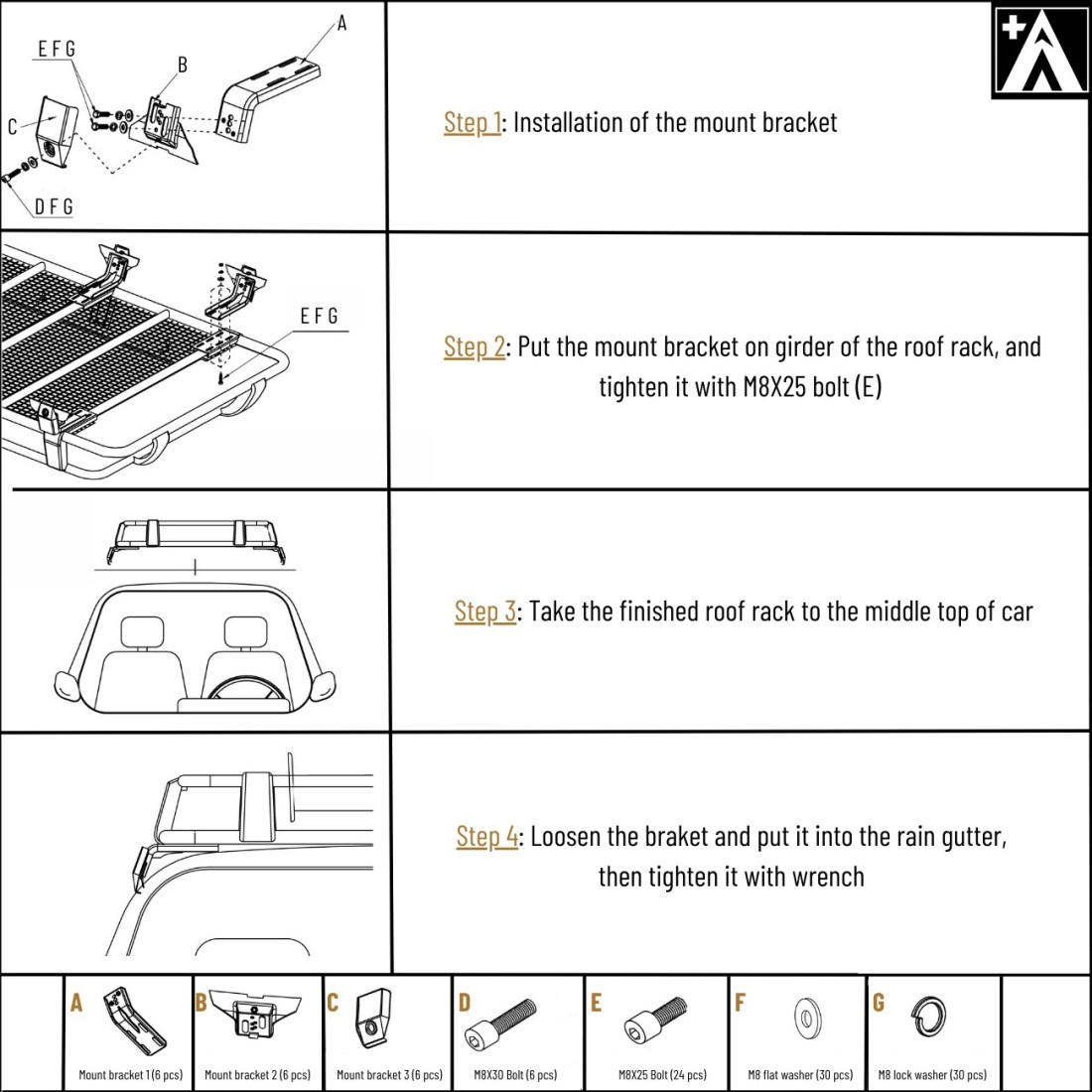 Wird mit 6 höhenverstellbaren Halterungen geliefert, um sich an die Breite Ihres Dachs anzupassen.