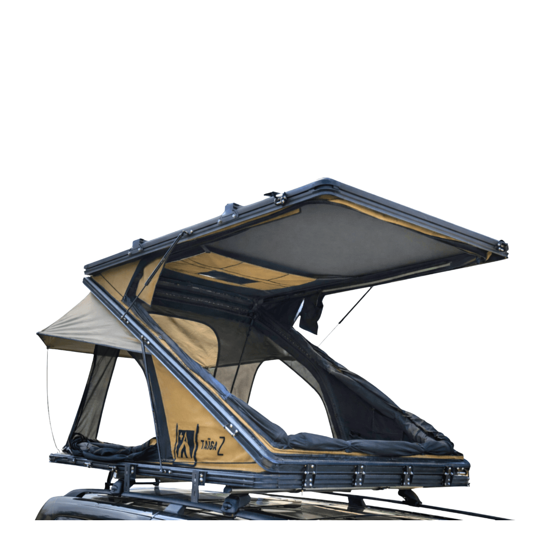 Genießen Sie optimalen Komfort mit dem aufstellbaren Dach des Taiga Z. Erleben Sie ein echtes Gefühl von Freiheit, ganz nah an der Natur, dank der vollständig ausrollbaren Zeltplane mit einer 270°-Panorama-Aussicht, und schlafen Sie unter dem Sternenhimmel, geschützt durch das Außenmoskitonetz. Die 22 cm starke Bauweise ermöglicht es, Wärmeisolierung, Schlafsäcke und Kissen im Dachzelt zu belassen, ohne sie entfernen zu müssen.