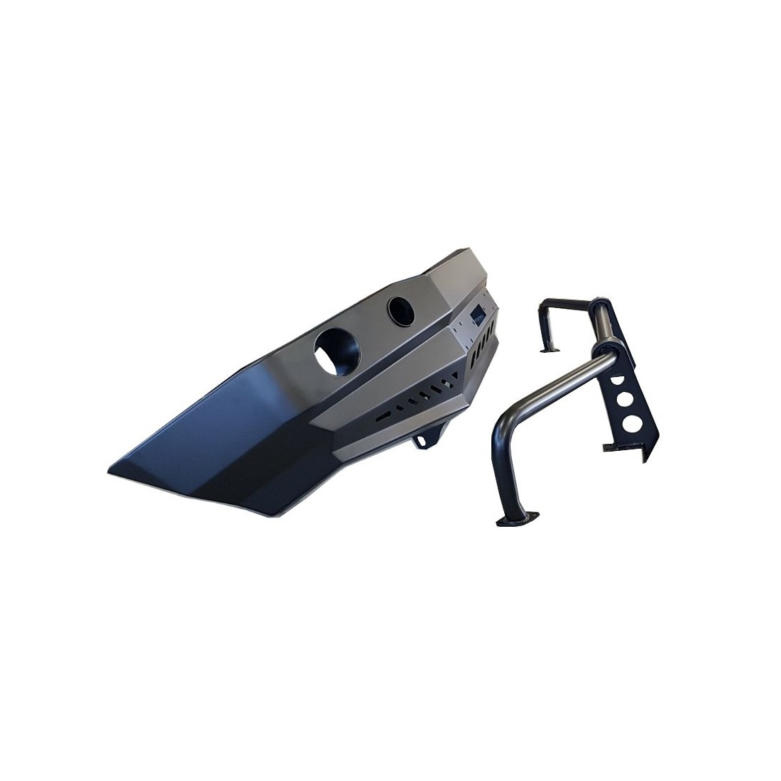 Die Stoßstange hat zwei Haken für die Drähte, die zwei Löcher für die Hebebühne und Löcher für Halogenlampen. Robuste Stahlkonstruktion ermöglicht die volle Nutzung der Stoßstange im Feld.