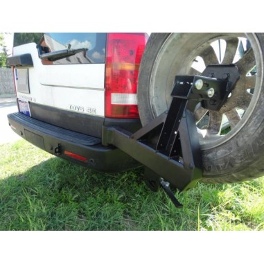 Reserveradhalterung für LAND ROVER DISCOVERY III für die Stoßstange F4x4. Die Montagestruktur besteht aus 4 mm dickem Blech. Das Produkt wird zuerst mit einem Laser geschnitten und dann auf einer Abkantpresse gebogen. Die richtige Form wird durch manuelles Schlichten erhalten. Die nächste Stufe ist der Korrosionsschutz, bestehend aus Verzinkung und Pulverbeschichtung, die der Befestigung das endgültige Aussehen verleiht. Die Montage des Rades wird durch eine Gasfeder unterstützt, die das Schließen und Öffnen in unebenem Gelände erleichtert. Die Befestigung ist sehr nützlich, wenn das Auto Räder mit großem Durchmesser hat, da die Scharniere der Heckklappe entlastet werden. Dank der soliden Konstruktion überträgt die Halterung keine Vibrationen und ungeordneten Geräusche in die Fahrzeugmitte. Der Griff ist mit einer Metallklammer verriegelt, die verhindert, dass sich die Klammer automatisch öffnet.