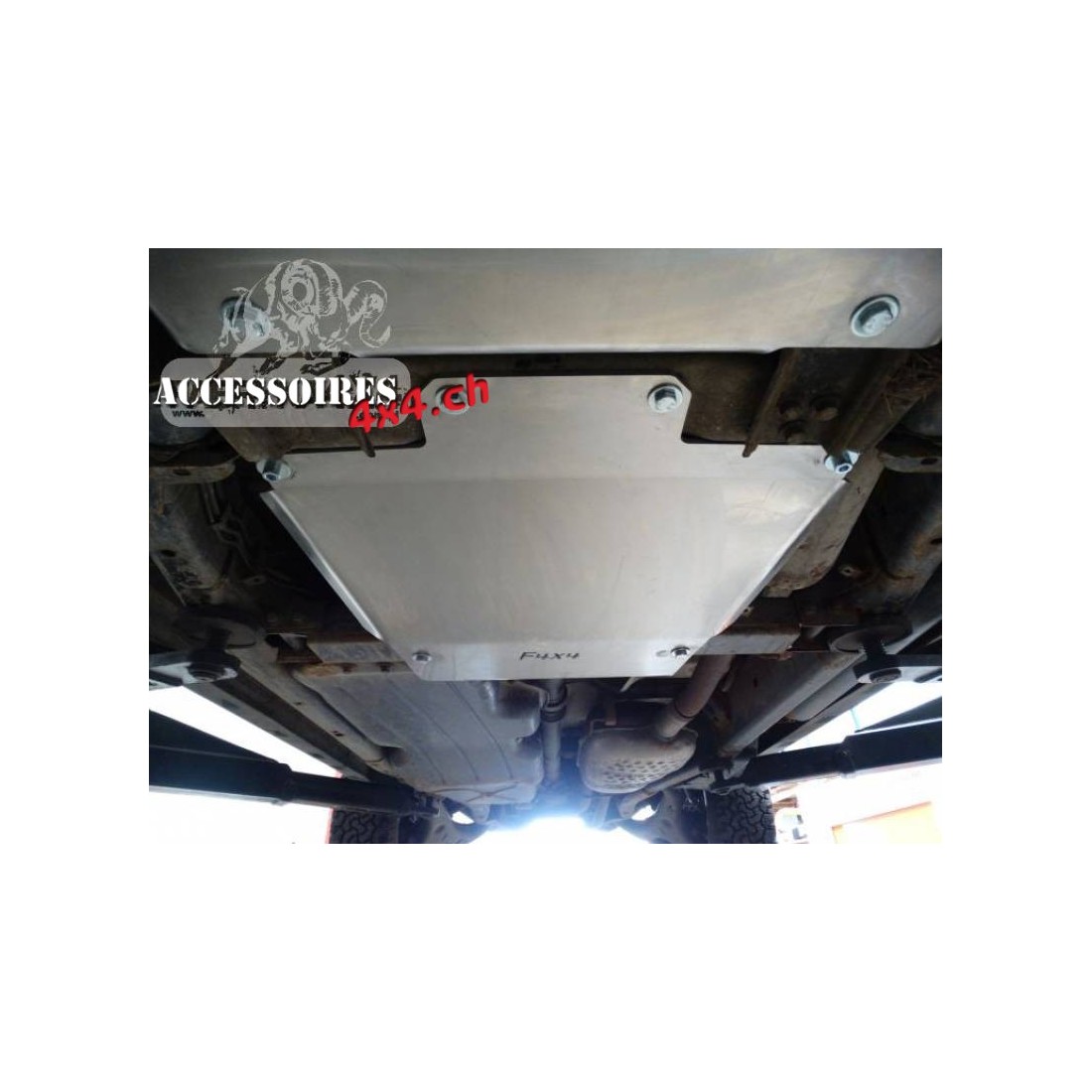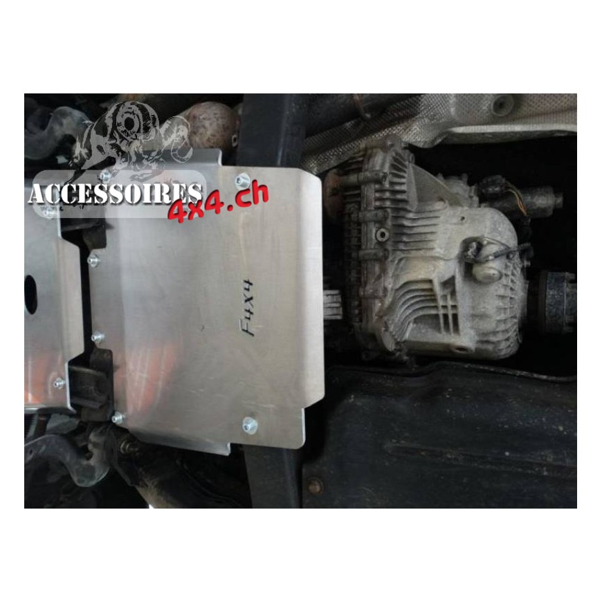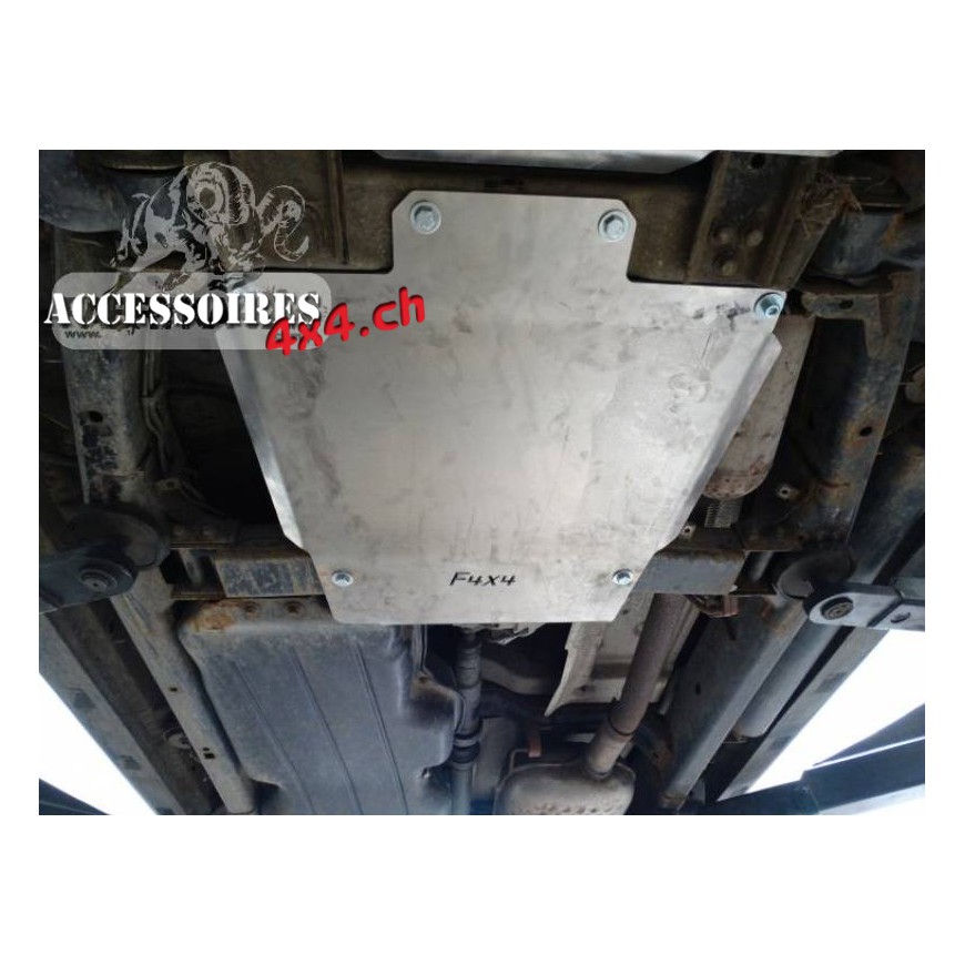 Getriebeabdeckung für das Auto LAND ROVER DISCOVERY III, aus 6 mm dickem Aluminium. Das Produkt wird zuerst mit einem Laser geschnitten und dann auf einer Abkantpresse gebogen. Die richtige Form wird durch manuelles Schlichten erhalten.