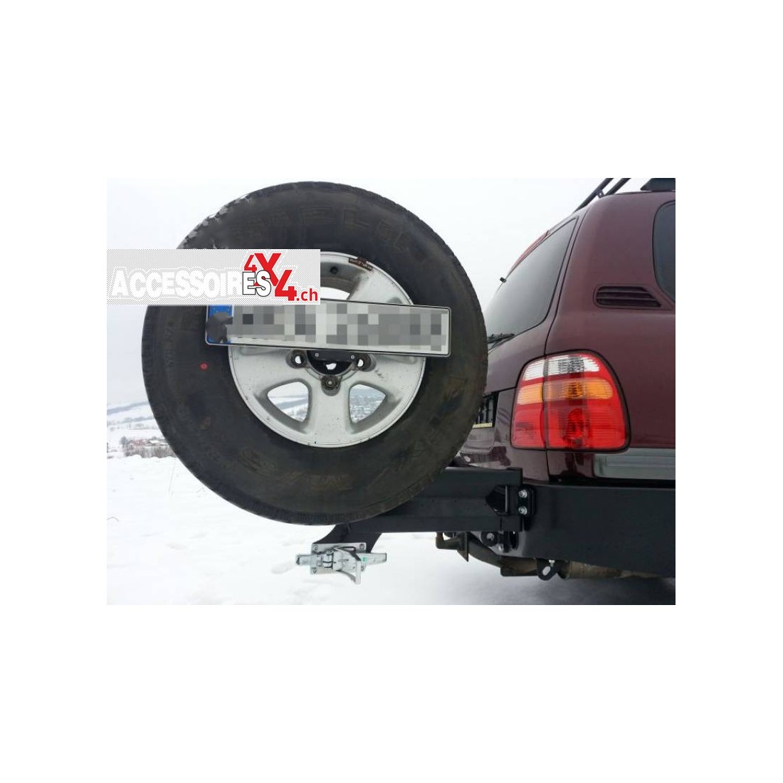 Reserveradhalterung für TOYOTA LAND CRUISER J100 für die Stoßstange F4x4. Die Montagestruktur besteht aus 4 mm dickem Blech. Das Produkt wird zuerst mit einem Laser geschnitten und dann auf einer Abkantpresse gebogen. Die richtige Form wird durch manuelles Schlichten erhalten. Die nächste Stufe ist der Korrosionsschutz, bestehend aus Verzinkung und Pulverbeschichtung, die der Befestigung das endgültige Aussehen verleiht. Die Montage des Rades wird durch eine Gasfeder unterstützt, die das Schließen und Öffnen in unebenem Gelände erleichtert. Die Befestigung ist sehr nützlich, wenn das Auto Räder mit großem Durchmesser hat, da die Scharniere der Heckklappe entlastet werden. Dank der soliden Konstruktion überträgt die Halterung keine Vibrationen und ungeordneten Geräusche in die Fahrzeugmitte. Der Griff ist mit einer Metallklammer verriegelt, die verhindert, dass sich die Klammer automatisch öffnet.