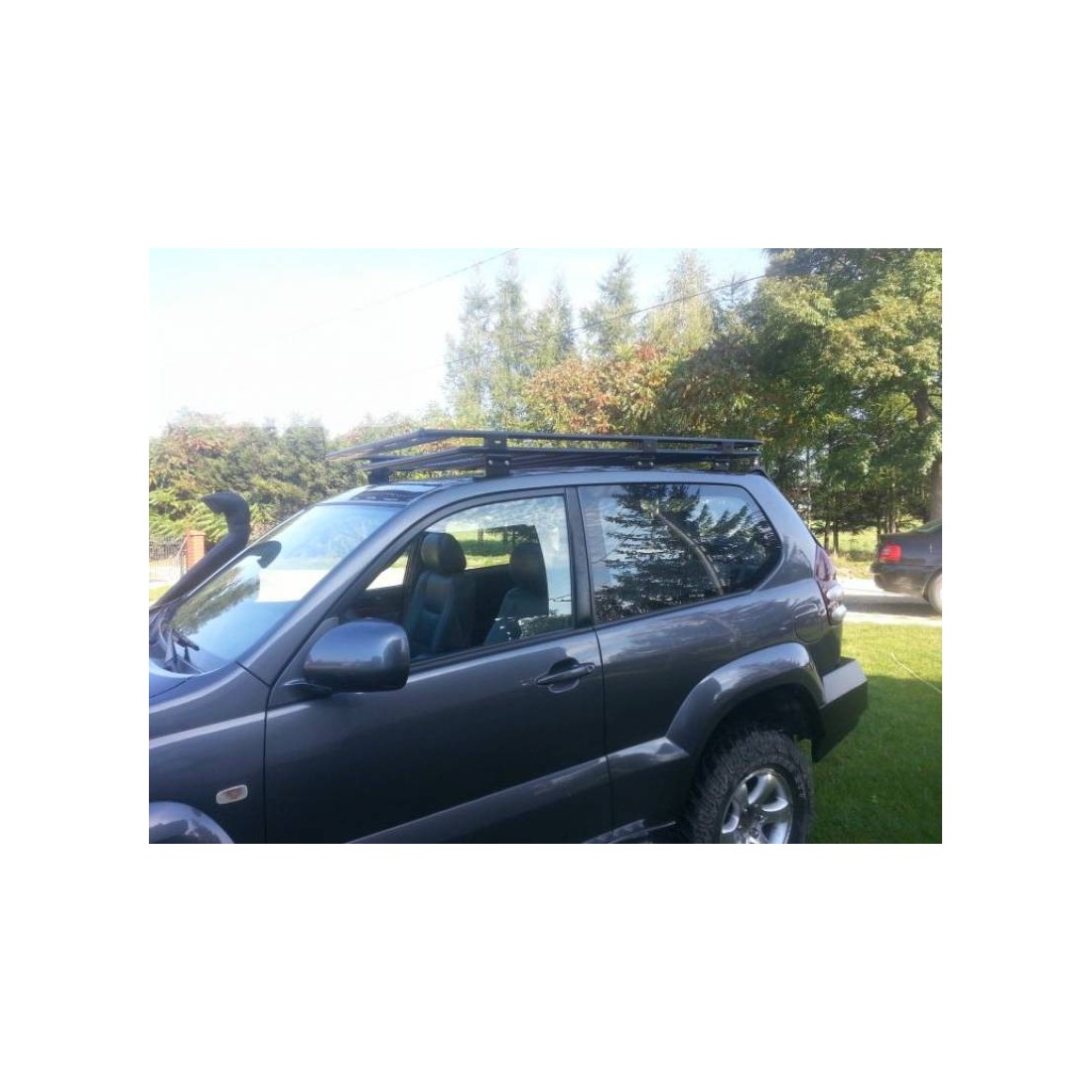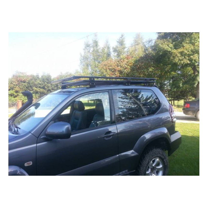 Dachträger für Toyota J125. Das Korbfach besteht aus Rohren mit einem Durchmesser von 25 mm. An der Vorderseite des Kofferraums erleichtert ein Band die Installation von Lampen und Halterungen für das Nummernschild. Ähnliche Lösungen finden sich an den Seiten und auf der Rückseite des Kofferraums. Sie können die Markise auch problemlos montieren. Der Dachträger ist einfach zu montieren und zu demontieren. Das wird lange her sein