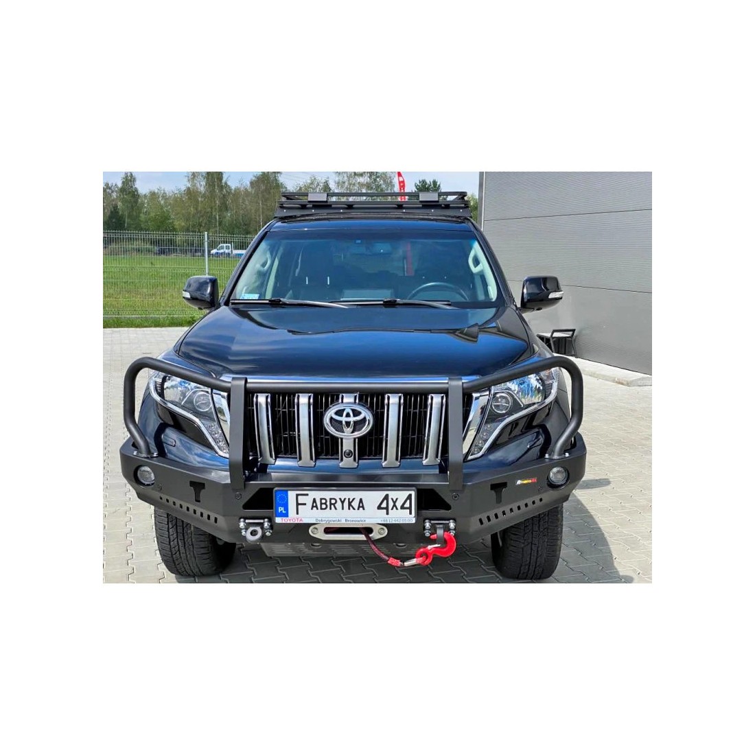 Frontstoßstange mit Winde Platte mit Büffel, gewidmet dem Auto Toyota J150 13-17. Die Hauptkonstruktion des Stoßfängers besteht aus 3 mm dickem Blech und die Platte für Winde und Befestigungselemente am Blechrahmen 5 mm dick. Das Produkt wird zuerst lasergeschnitten und dann auf einer numerisch gesteuerten Abkantpresse gefaltet. Die richtige Form wird durch manuelles Schlichten erhalten. Der nächste Schritt ist der Korrosionsschutz, der aus einer Verzinkung und einer Pulverbeschichtung besteht, die dem Stoßfänger ein endgültiges Aussehen verleiht. Dieser Stoßfänger verfügt über Befestigungslöcher für die Griffe, zwei Löcher zum Anheben und Löcher für Halogenlampen. Die solide Stahlkonstruktion ermöglicht einen kraftvollen Einsatz des Stoßfängers im Feld. Der Stoßfänger verbessert den Komfort beim Fahren im Gelände erheblich, ermöglicht den praktischen Einsatz der Winde, verbessert die Sicherheit und verleiht dem Fahrzeug seinen angemessenen Charakter. Im Spiel finden Sie alle notwendigen Elemente für die Montage.