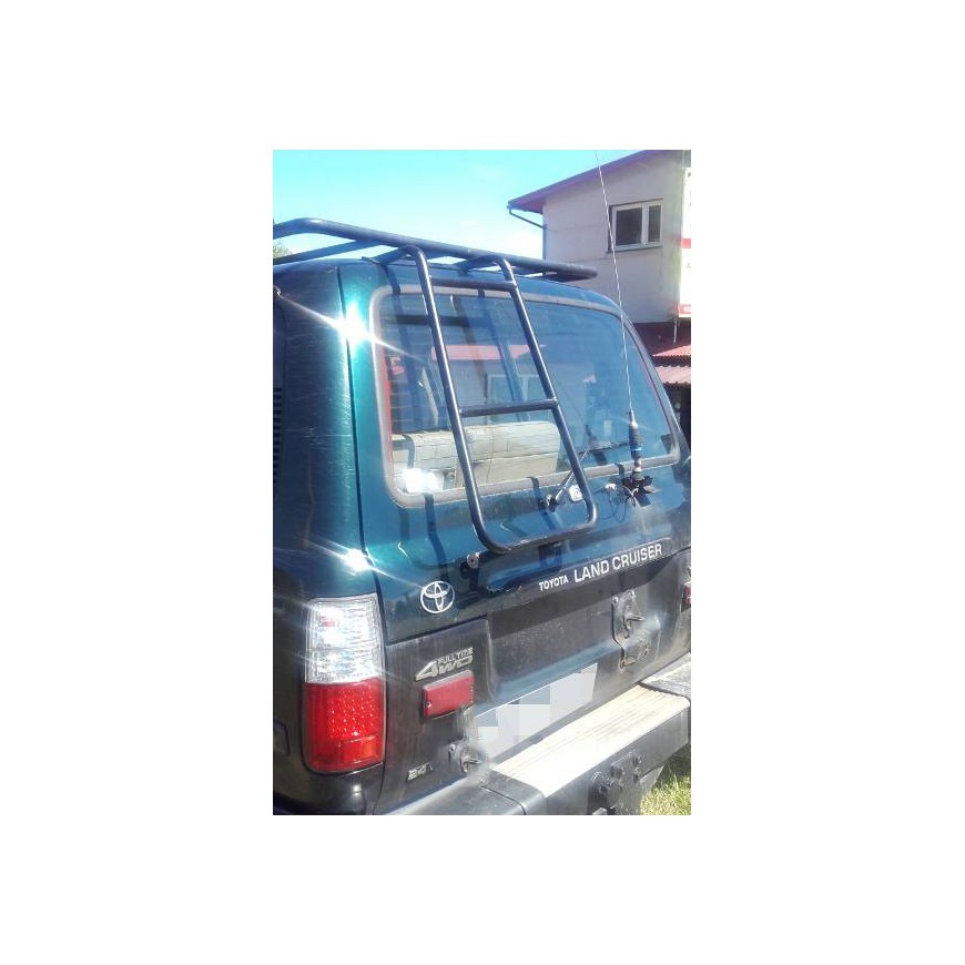 Die Leiter besteht aus Ø 25mm Rohr. Das Produkt wird komplett von Hand gefertigt. Nach Fertigstellung wird es durch eine Korrosionsschutzgrundierung geschützt. Der nächste Schritt ist die Pulverbeschichtung. Die von oben gesehene Leiter stützt sich an der Kante der hinteren Tür ab und ist von unten starr daran befestigt. Sehr nützlich bei Verwendung eines Dachträgers.