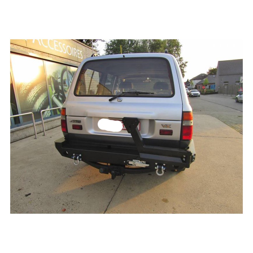 Reserveradhalterung für TOYOTA LAND CRUISER J80 89-98 für die Stoßstange F4x4. Die Montagestruktur besteht aus 4 mm dickem Blech. Das Produkt wird zuerst mit einem Laser geschnitten und dann auf einer Abkantpresse gebogen. Die richtige Form wird durch manuelles Schlichten erhalten. Die nächste Stufe ist der Korrosionsschutz, bestehend aus Verzinkung und Pulverbeschichtung, die der Befestigung das endgültige Aussehen verleiht. Die Montage des Rades wird durch eine Gasfeder unterstützt, die das Schließen und Öffnen in unebenem Gelände erleichtert. Die Befestigung ist sehr nützlich, wenn das Auto Räder mit großem Durchmesser hat, da die Scharniere der Heckklappe entlastet werden. Dank der soliden Konstruktion überträgt die Halterung keine Vibrationen und ungeordneten Geräusche in die Fahrzeugmitte. Der Griff ist mit einer Metallklammer verriegelt, die verhindert, dass sich die Klammer automatisch öffnet.