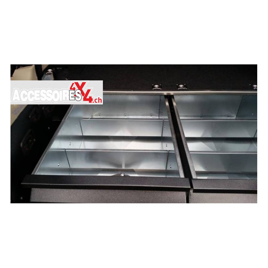 Schlafwagenaufbau für NISSAN PATROL Y61. Die tragende Struktur der Karosserie sowie die Schubladen bestehen aus verzinktem Stahlblech, was einen sehr guten Korrosionsschutz darstellt. Der Schubladenöffnungsmechanismus besteht aus einem Edelstahlprofil und einem Satz Wälzlager, die sowohl unten als auch oben an den Führungen sowie an den Seiten der Schublade angebracht sind. Diese Konstruktion der Führungen beseitigt jegliches Spiel zwischen der Schublade und der Tragkonstruktion, was garantiert, dass während der Fahrt auf dem Feld keine unangenehmen Geräusche von der Karosserie ausgehen und eine hohe Zuverlässigkeit gewährleistet. Jede der Schubladen ist mit zwei Trennwänden ausgestattet, die je nach Bedarf herausgenommen werden können. Anstelle des Rückensofas sind zusätzliche Koffer angebracht, die zusammen mit dem hinteren Körperteil ein flaches Ganzes zum Schlafen bilden. Der mittlere Kofferraum hat eine Perforation und ist ein idealer Ort für einen Kühlschrank, während die Seitenkoffer einen großen Laderaum bieten. Es gibt einen großen, funktionalen Stauraum zwischen den vorderen Modulen und der Rückseite der Karosserie. Die Fronten sind in antikem Silber pulverbeschichtet, was die gesamte Ästhetik verleiht. Beide Schubladen sind mit massiven, abschließbaren Edelstahlschlössern ausgestattet. Der obere Teil besteht aus Sperrholz, das mit Filz überzogen und an den Kanten mit einer Aluminiumecke befestigt ist. Dadurch fügt sich das Ganze gut in den Innenraum des Autos ein und ist angenehm zu bedienen. Die Karosserie ist mit acht Schließfachgriffen ausgestattet, die den Schutz vor rutschenden Gegenständen wie einem Kühlschrank oder einem auf der Oberfläche abgestellten Kofferraum ermöglichen. An den Seiten der Verkleidung mit Schubladen und hinter dem Rückensofa befinden sich zusätzliche Ablagefächer, die eine maximale Nutzung des Gepäckraums und eine bessere Organisation der Gegenstände ermöglichen, die wir auf der Reise mitnehmen. Bei der Konstruktion der Karosserie haben wir auf eine einfache Montage geachtet, dank der eine Person die Montage selbst durchführen kann, und die Montage erfolgte, ohne das ursprüngliche Innere des Kofferraums zu stören. Einer der vielen Vorteile der Karosserie ist, dass sie jederzeit aus dem Auto entfernt und bei Bedarf wieder eingebaut werden kann. Schlafmöbel sind eine ideale Lösung für lange Reisen, sie sorgen für große Unabhängigkeit und Komfort auf Reisen.