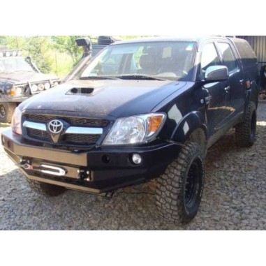 Front bumper with plate for winch without bullbar, dedicated to TOYOTA HILUX 05-08. The main construction of the bumper is made of 4mm thick sheet metal, and the plate for the winch and frame fasteners from 5mm thick sheet metal. The product is first cut by laser, then bent on a CNC press brake, and the right shape is obtained by manual finishing. The next stage is corrosion protection consisting of galvanizing and powder coating which gives the bumper a final look.