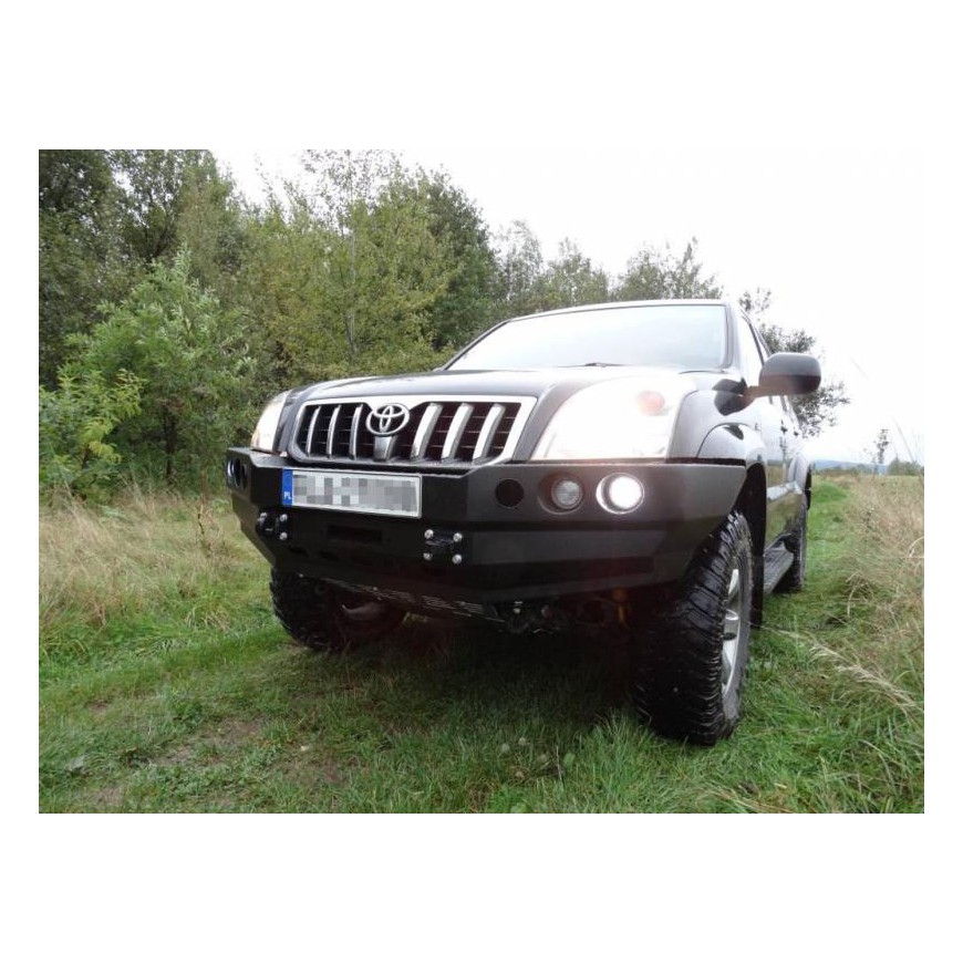 Front bumper with plate for winch without bullbar, dedicated to TOYOTA LAND CRUISER J120. The main construction of the bumper is made of 4mm thick sheet metal, and the plate for the winch and frame fasteners from 5mm thick sheet metal. The product is first cut by laser, then bent on a CNC press brake, and the right shape is obtained by manual finishing. The next stage is corrosion protection consisting of galvanizing and powder coating which gives the bumper a final look.