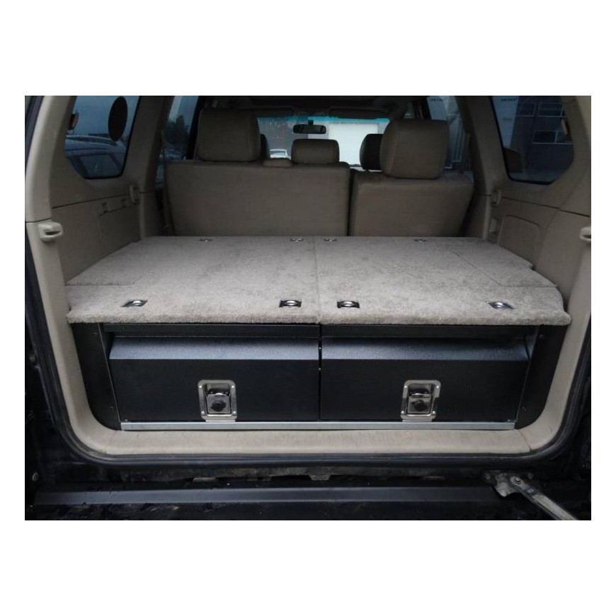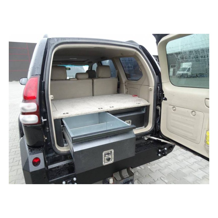 The first steel construction, produced in series in a self-assembly technology, of the highest quality and with the desire to integrate inside the car. The load-bearing structure of the crate, as well as the drawers, are made of galvanized sheet steel which offers a very good protection against corrosion. The drawer opening mechanism consists of a stainless steel section and a set of bearings mounted on both the bottom and top of the guides as well as on the sides of the drawer. This construction of the guides eliminates any play between the drawer and the support structure, which ensures that no unpleasant noise is emitted by the bodywork when driving in the field and guarantees high reliability. Each drawer is equipped with two partitions that can be removed as needed. The facades are painted with antique silver powder, which gives all their aesthetics. Both drawers are equipped with solid stainless steel locks that can be locked. The upper part is made of plywood covered with felt, fixed on the edges with an aluminum corner, which allows the whole to blend perfectly into the cockpit of the car and is pleasant to use. The body is equipped with eight locker handles, allowing protection against slippery objects such as a refrigerator or a chest placed on its surface. On the sides of the panel with drawers and behind the rear sofa, there are additional storage compartments, which allows maximum use of the space for luggage and a better organization of objects that we carry on a trip.