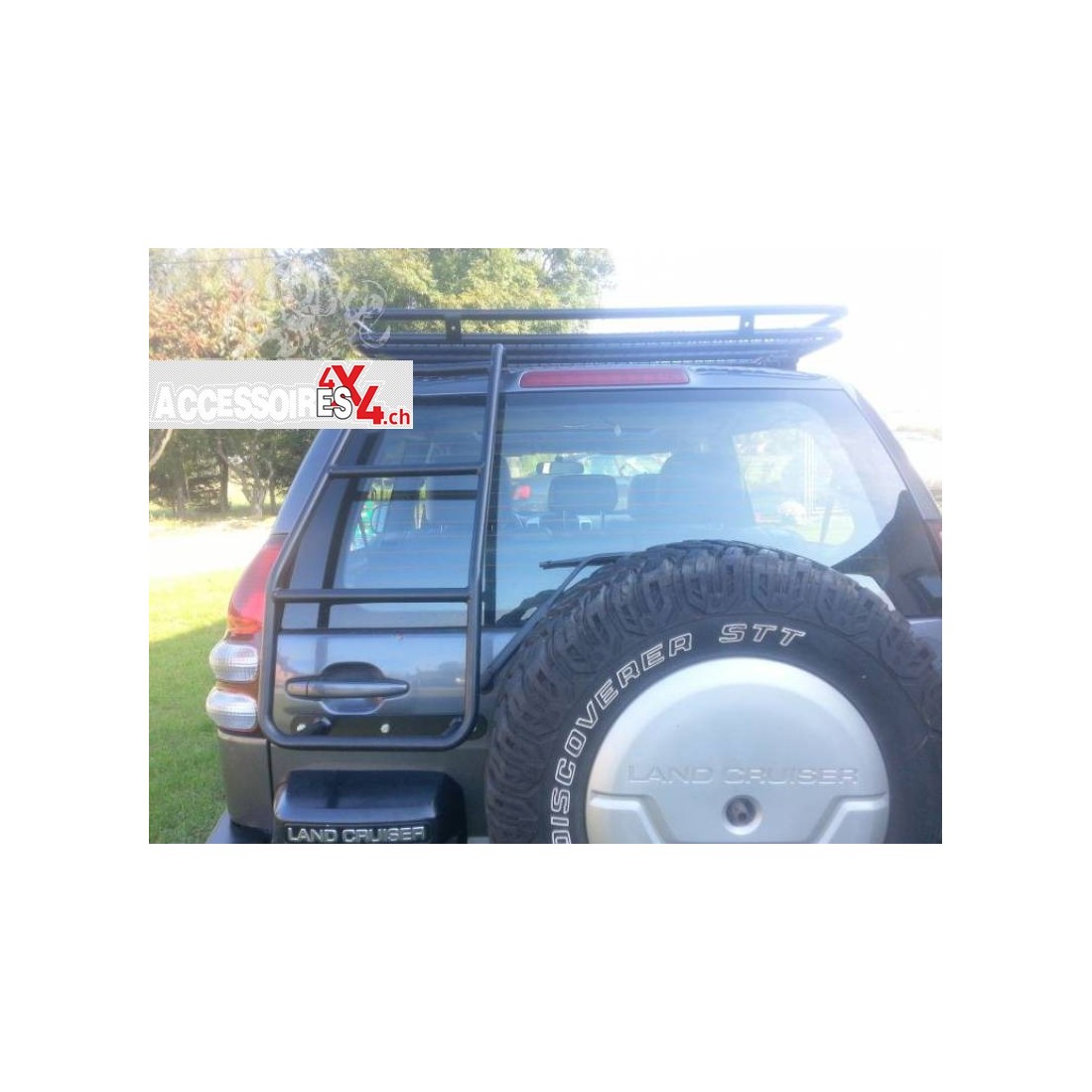 The ladder is made of Ø 25mm pipe. The product is entirely made by hand. Once finished, it is protected by an anticorrosive primer. The next step is the powder coating. The ladder seen from above is supported on the edge of the rear door and, from below, is mounted rigidly thereon. Very useful when using a roof rack.