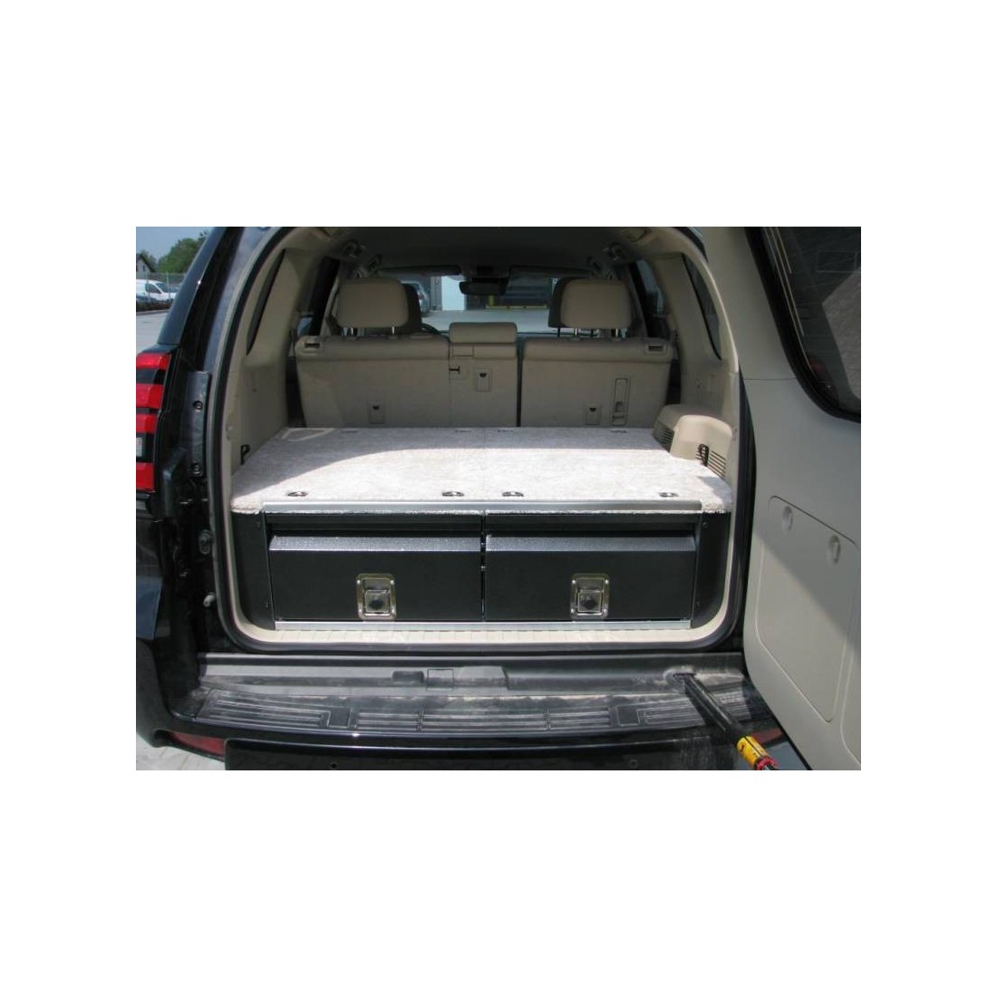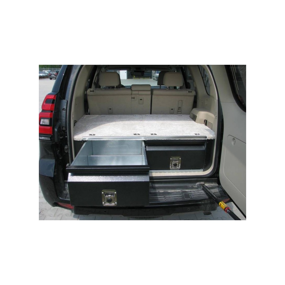 The first steel construction, produced in series in a self-assembly technology, of the highest quality and with the desire to integrate inside the car. The load-bearing structure of the crate, as well as the drawers, are made of galvanized sheet steel which offers a very good protection against corrosion. The drawer opening mechanism consists of a stainless steel section and a set of bearings mounted on both the bottom and top of the guides as well as on the sides of the drawer. This construction of the guides eliminates any play between the drawer and the support structure, which ensures that no unpleasant noise is emitted by the bodywork when driving in the field and guarantees high reliability. Each drawer is equipped with two partitions that can be removed as needed. The facades are painted with antique silver powder, which gives all their aesthetics. Both drawers are equipped with solid stainless steel locks that can be locked. The upper part is made of plywood covered with felt, fixed on the edges with an aluminum corner, which allows the whole to blend perfectly into the cockpit of the car and is pleasant to use. The body is equipped with eight locker handles, allowing protection against slippery objects such as a refrigerator or a chest placed on its surface. On the sides of the panel with drawers and behind the rear sofa, there are additional storage compartments, which allows maximum use of the space for luggage and a better organization of objects that we carry on a trip.