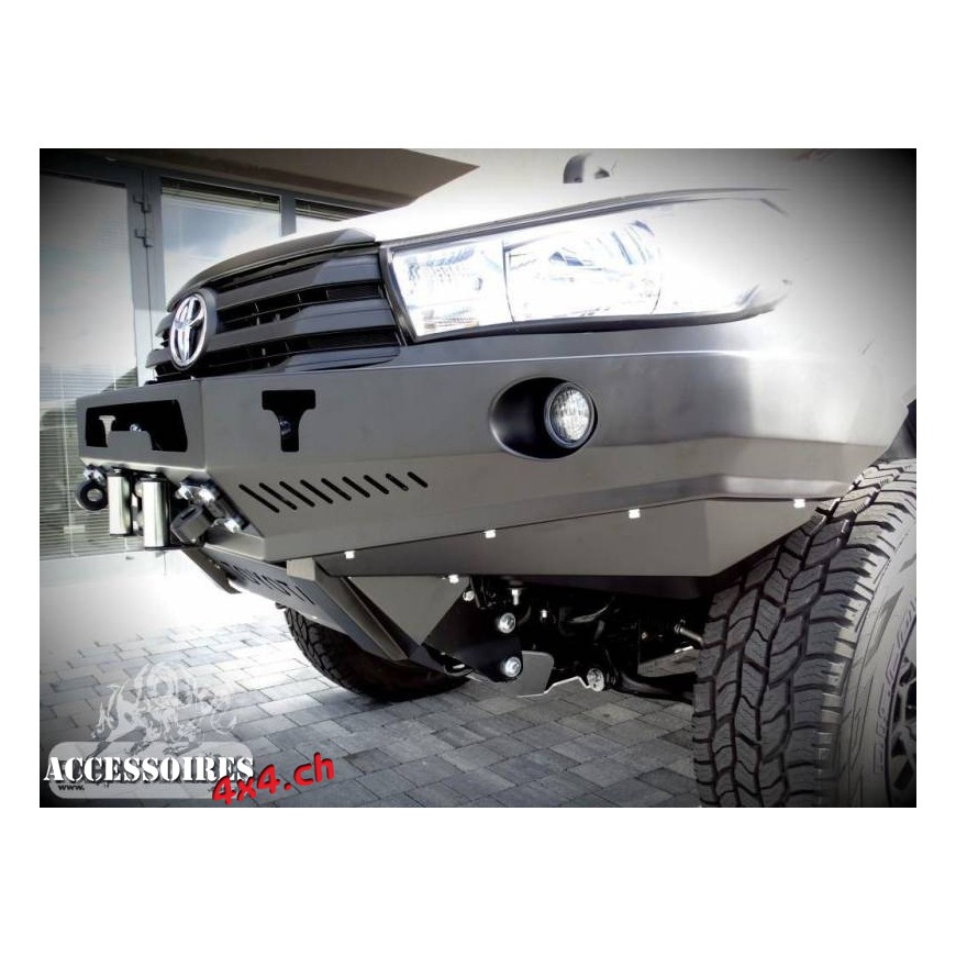 Front bumper with plate for winch without bullbar, dedicated to TOYOTA HILUX Revo 2016. The main construction of the bumper is made of 4mm thick sheet metal, and the plate for the winch and frame fasteners from 5mm thick sheet metal. The product is first cut by laser, then bent on a CNC press brake, and the right shape is obtained by manual finishing. The next stage is corrosion protection consisting of galvanizing and powder coating which gives the bumper a final look.