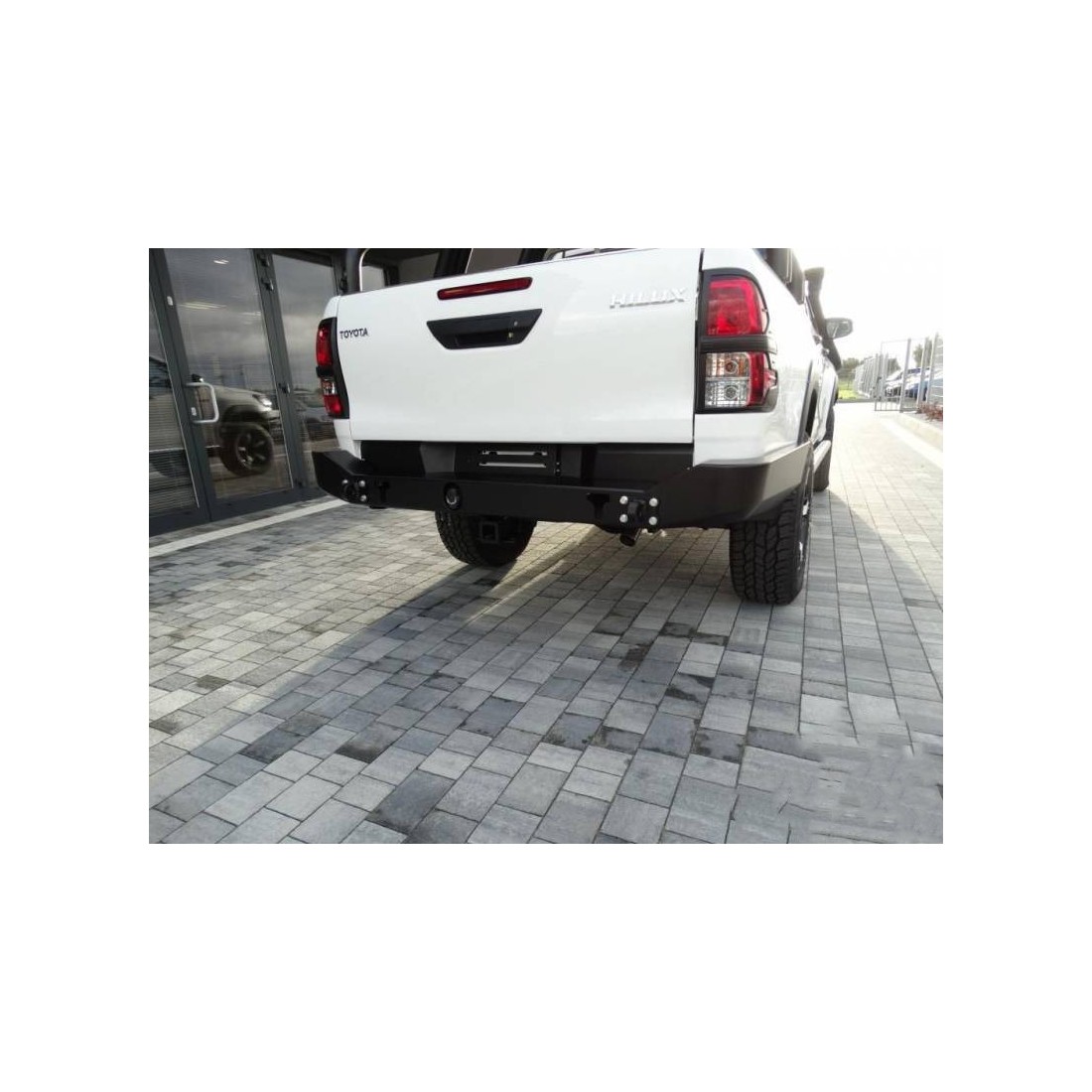 Rear bumper dedicated to the car TOYOTA HILUX Revo 2016. The main construction of the bumper is made of 4mm thick sheet metal, and the frame fasteners are made of 5mm thick sheet metal. The product is first cut by laser, then bent on a CNC press brake, and the right shape is obtained by manual finishing. The next stage is corrosion protection consisting of galvanizing and powder coating which gives the bumper a final look.