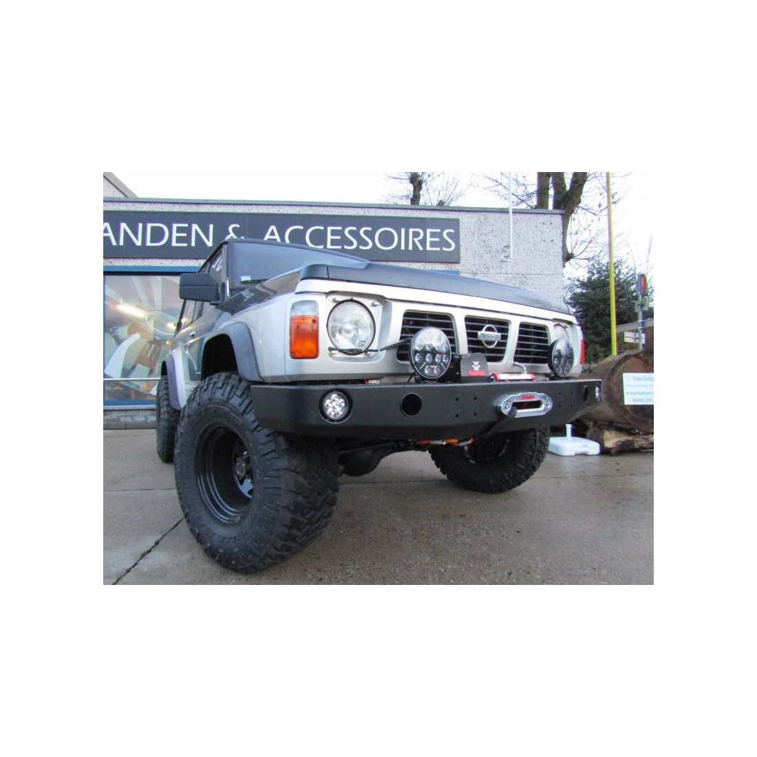 Front bumper with winch plate without stabilizer bar, dedicated to NISSAN PATROL Y60. The main construction of the bumper consists of 4 mm thick sheet metal, and the plate for winch and sheet metal frame fasteners 5 mm thick. The product is first laser cut, then folded on a numerically controlled press brake. The correct shape is obtained by manual finishing. The next step is the corrosion protection, which consists of a galvanizing and a powder coating that gives the bumper a final appearance. This bumper has mounting holes for the grips, two holes for high lift and two holes for halogen lamps. The solid steel construction allows full operation of the bumper on the ground. The bumper significantly improves the comfort of off-road driving, allows a practical use of the winch, improves safety and gives the car its appropriate character. In the game you will find all the necessary components for assembly.