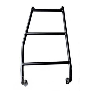 The ladder is made of Ø 25mm pipe. The product is entirely made by hand. Once finished, it is protected by an anticorrosive primer. The next step is the powder coating. The ladder seen from above is supported on the edge of the rear door and, from below, is mounted rigidly thereon. Very useful when using a roof rack.
