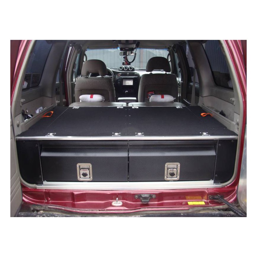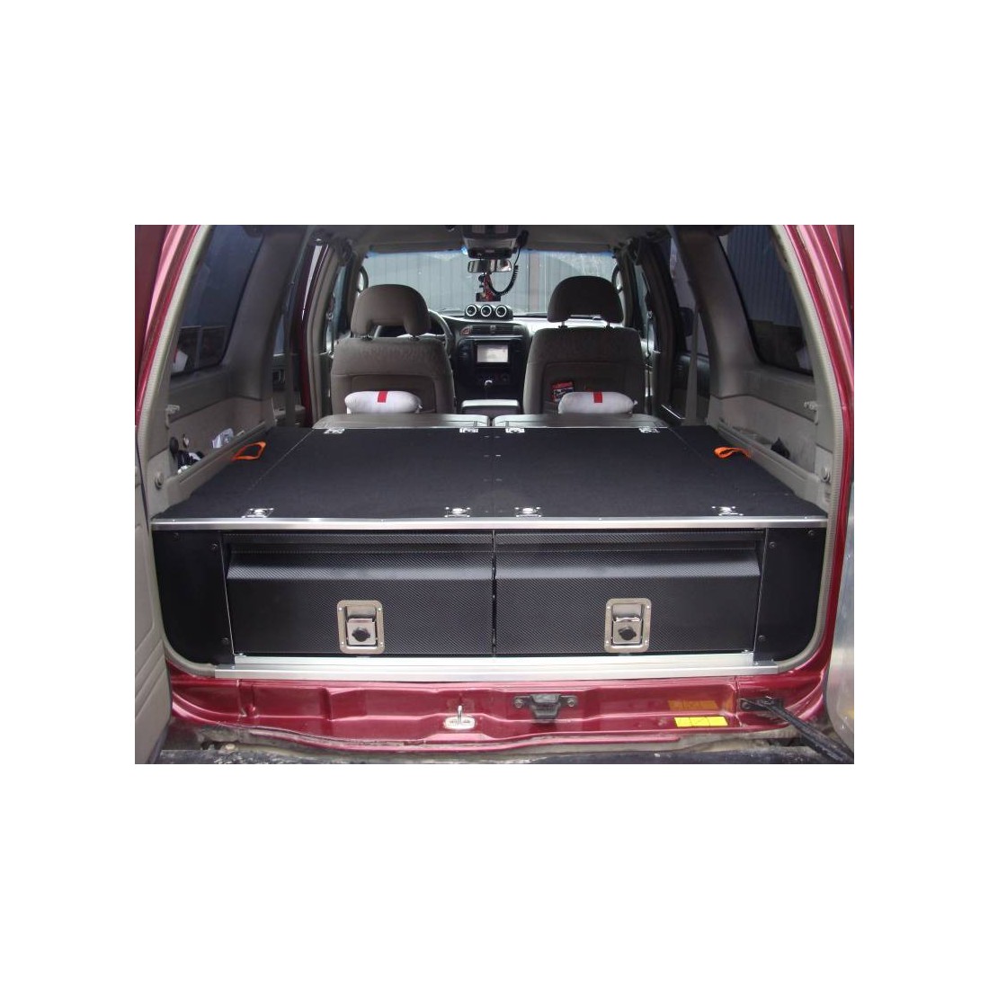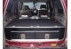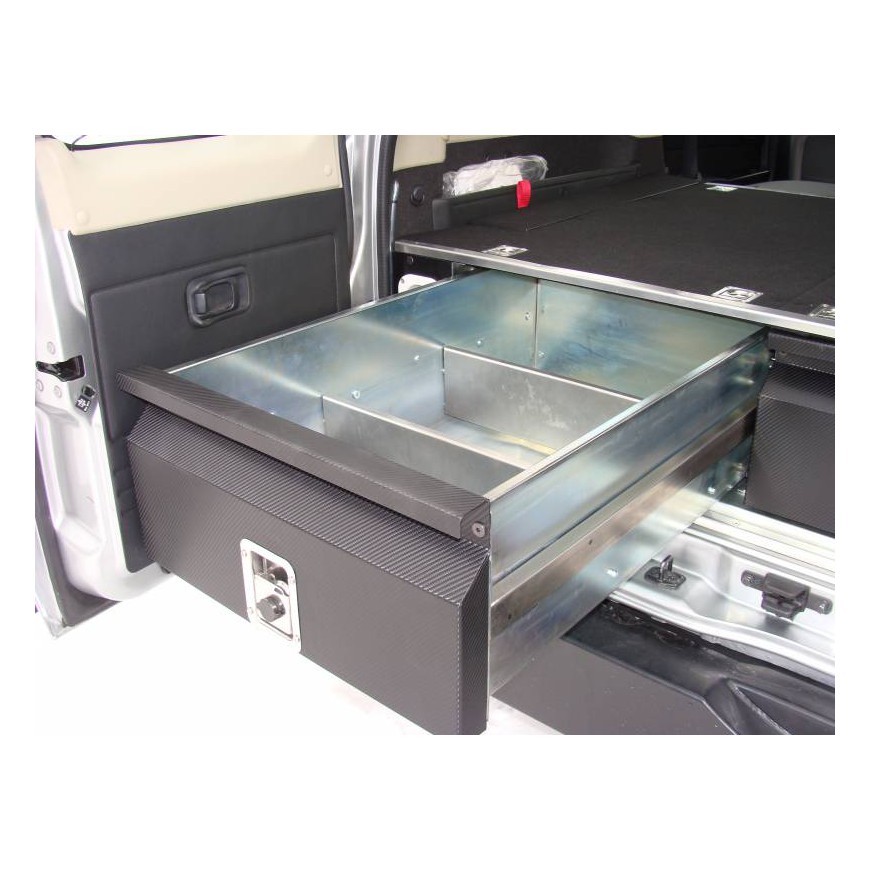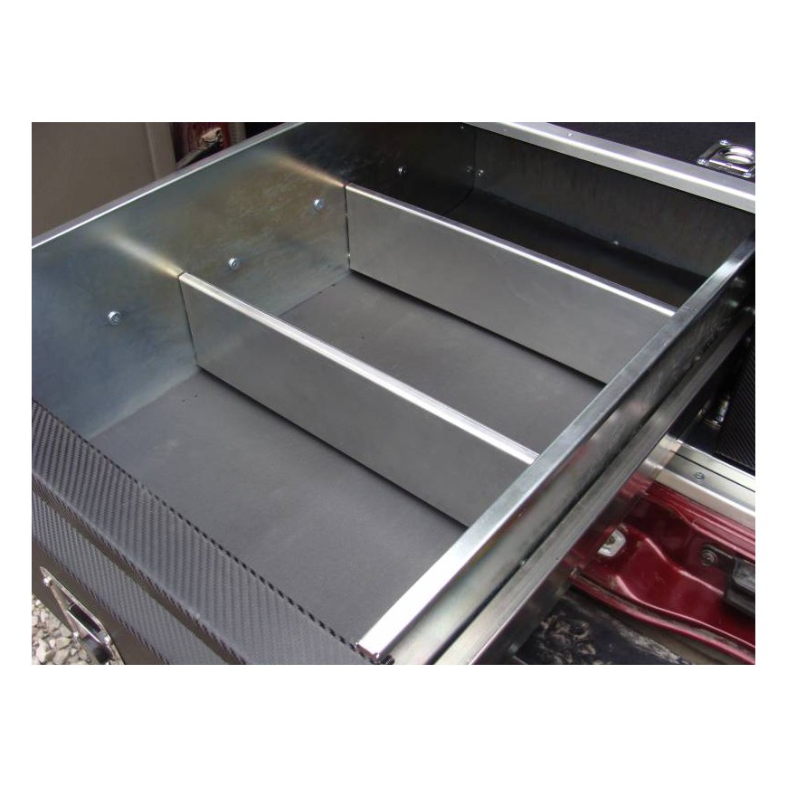 The first steel construction, produced in series in a self-assembly technology, of the highest quality and with the desire to integrate inside the car. The load-bearing structure of the crate, as well as the drawers, are made of galvanized sheet steel which offers a very good protection against corrosion. The drawer opening mechanism consists of a stainless steel section and a set of bearings mounted on both the bottom and top of the guides as well as on the sides of the drawer. This construction of the guides eliminates any play between the drawer and the support structure, which ensures that no unpleasant noise is emitted by the bodywork when driving in the field and guarantees high reliability. Each drawer is equipped with two partitions that can be removed as needed. The facades are painted with antique silver powder, which gives all their aesthetics. Both drawers are equipped with solid stainless steel locks that can be locked. The upper part is made of plywood covered with felt, fixed on the edges with an aluminum corner, which allows the whole to blend perfectly into the cockpit of the car and is pleasant to use. The body is equipped with eight locker handles, allowing protection against slippery objects such as a refrigerator or a chest placed on its surface. On the sides of the panel with drawers and behind the rear sofa, there are additional storage compartments, which allows maximum use of the space for luggage and a better organization of objects that we carry on a trip.