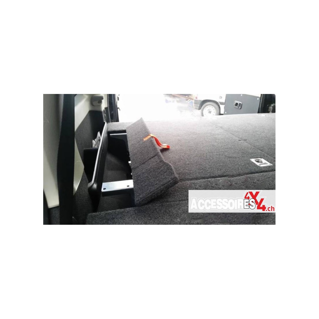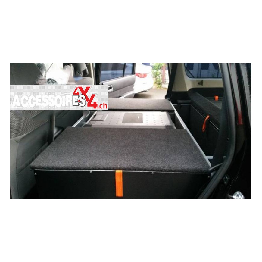 Sleeping van body dedicated to NISSAN PATROL Y61. The supporting structure of the body, as well as the drawers, are made of sheet steel, which is galvanized, which is a very good corrosion protection. The drawer opening mechanism consists of a stainless steel section and a set of rolling bearings mounted both at the bottom and top of the guides, as well as on the sides of the drawer. This construction of the guides eliminates any play between the drawer and the supporting structure, which guarantees that no unpleasant noises are emitted from the bodywork while driving in the field and ensures high reliability. Each of the drawers is equipped with two partitions, which can be removed depending on the needs. In place of the rear sofa, additional trunks are mounted, which together with the rear part of the body form one flat whole for sleeping. The middle trunk has cut out perforation and is an ideal place for a fridge, while the side cases are a great cargo space. There is a large, functional storage space between the front modules and the rear of the body. The fronts are powder-painted in antique silver, which gives the whole aesthetics. Both drawers are equipped with solid stainless steel locks that can be locked. The upper part is made of plywood covered with felt fabric, secured on the edges with an aluminum corner, which causes that the whole blends in nicely with the interior of the car and is pleasant to use. The bodywork is equipped with eight locker handles, enabling protection against sliding objects such as a fridge or a trunk placed on its surface. On the sides of the panel with drawers and behind the rear sofa there are additional storage compartments, which allows maximum use of the luggage space and better organization of items that we take on the trip. When constructing the body, we took care of easy assembly, thanks to which one person can do the assembly themselves, and the assembly took place without disturbing the original interior of the trunk. One of the many advantages of the body is that it can be removed from the car at any time and reinstalled if necessary. Sleeping furniture is an ideal solution for long journeys, it ensures great independence and comfort of traveling.