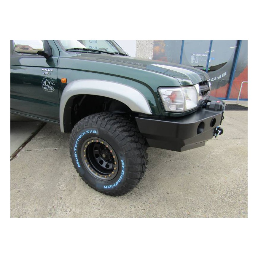 Paragolpes delantero con placa para cabrestante sin barra, dedicado al automóvil TOYOTA HILUX 98-05. La construcción principal del parachoques está hecha de chapa de metal de 4 mm de espesor, y la placa para el cabrestante y los sujetadores del marco de chapa de metal de 5 mm de espesor. El producto se corta primero con láser, luego se dobla sobre una prensa plegadora CNC y se obtiene la forma correcta mediante acabado manual. La siguiente etapa es la protección contra la corrosión que consiste en galvanizado y recubrimiento en polvo que le da al parachoques una apariencia final.