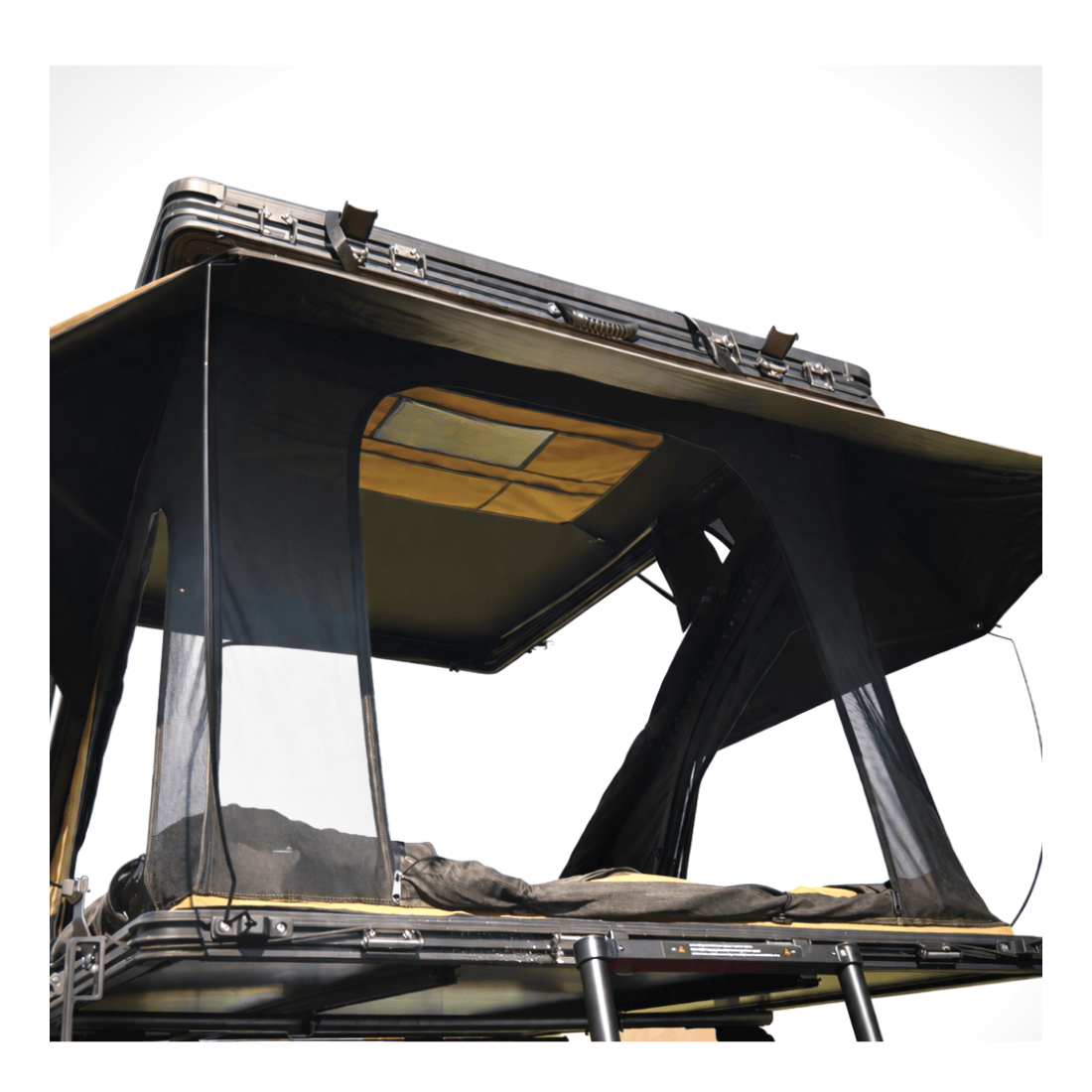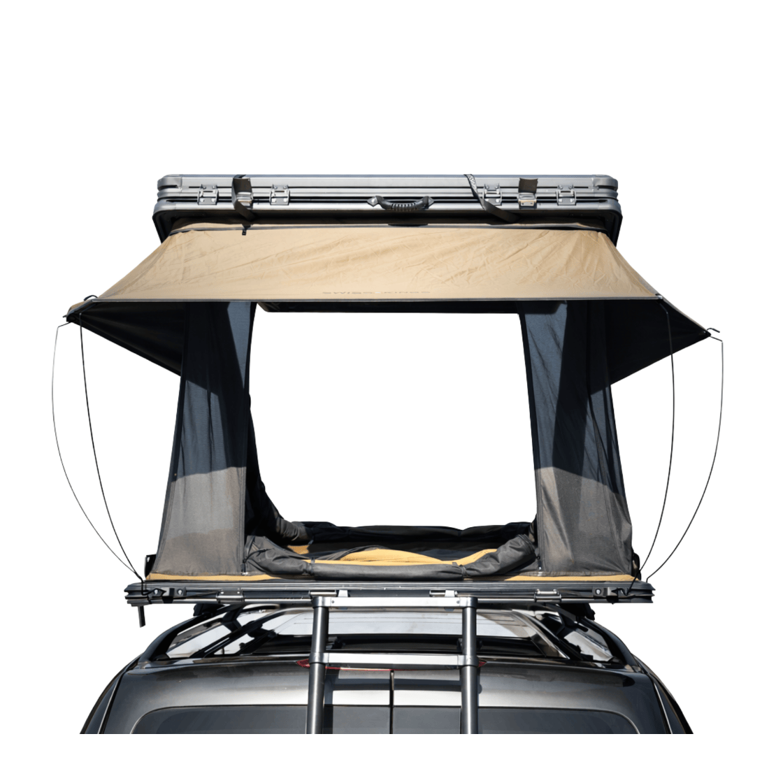 Transforme su tienda de techo en una cómoda terraza y duerma bajo el cielo estrellado, protegido por la mosquitera exterior.
