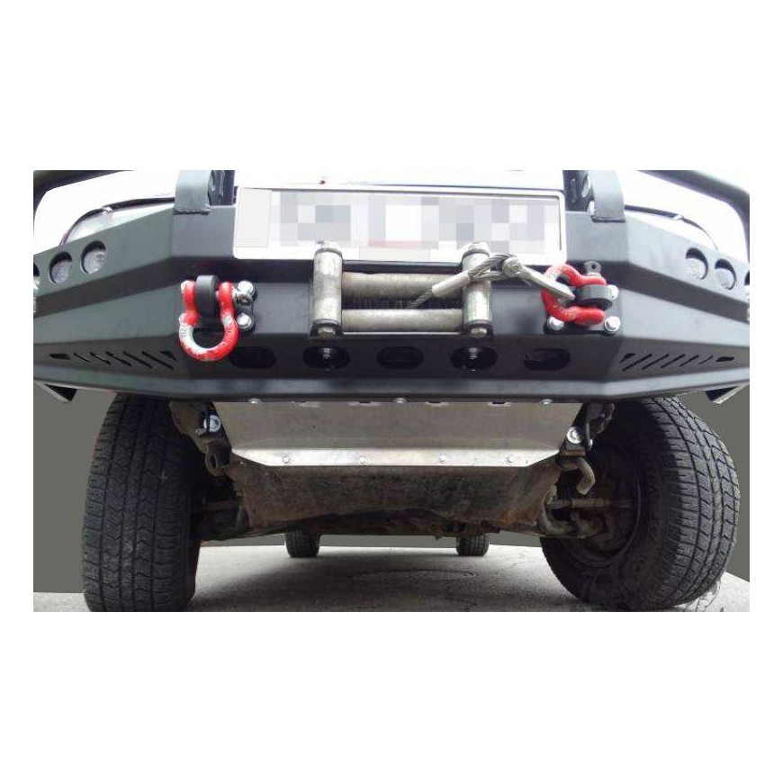 El paragolpes tiene dos ganchos para los cables, los dos agujeros para el ascensor hi-lift y los agujeros para las lámparas halógenas. La robusta construcción de acero permite el uso completo del paragolpes en el campo.
