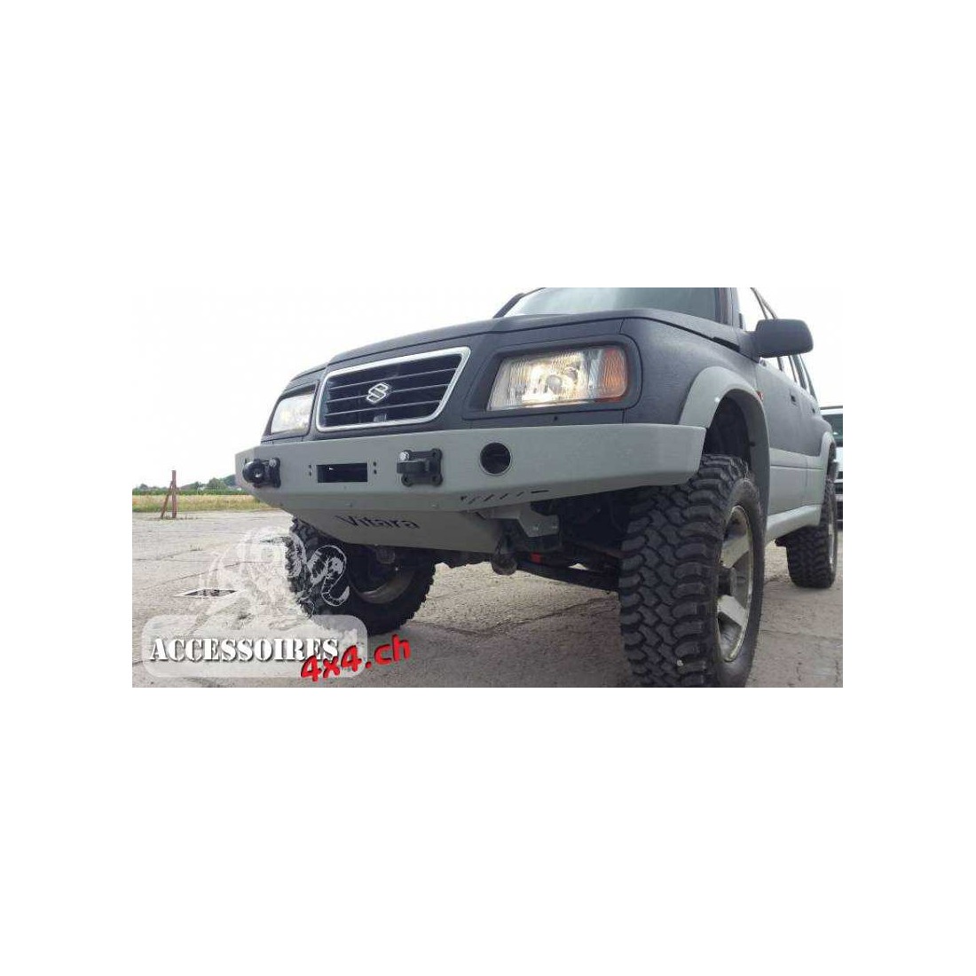 El paragolpes tiene dos ganchos para los cables, los dos agujeros para el ascensor hi-lift y los agujeros para las lámparas halógenas. La robusta construcción de acero permite el uso completo del paragolpes en el campo.