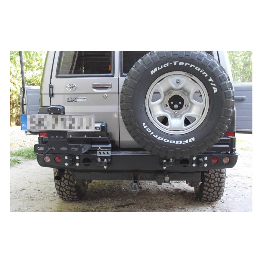 Soporte de rueda de repuesto para el coche TOYOTA HZJ71 99-07 dedicado al parachoques F4x4. La estructura de montaje está hecha de chapa de 4 mm de espesor. El producto se corta primero con láser, luego se dobla sobre una prensa plegadora y se obtiene la forma correcta mediante acabado manual. La siguiente etapa es la protección contra la corrosión que consiste en galvanizado y recubrimiento en polvo que le da la apariencia final a la fijación. Montar la rueda alivia la puerta trasera y es útil cuando el automóvil tiene ruedas de gran diámetro. Gracias a la construcción sólida, el soporte no transfiere vibraciones y sonidos al centro del automóvil.