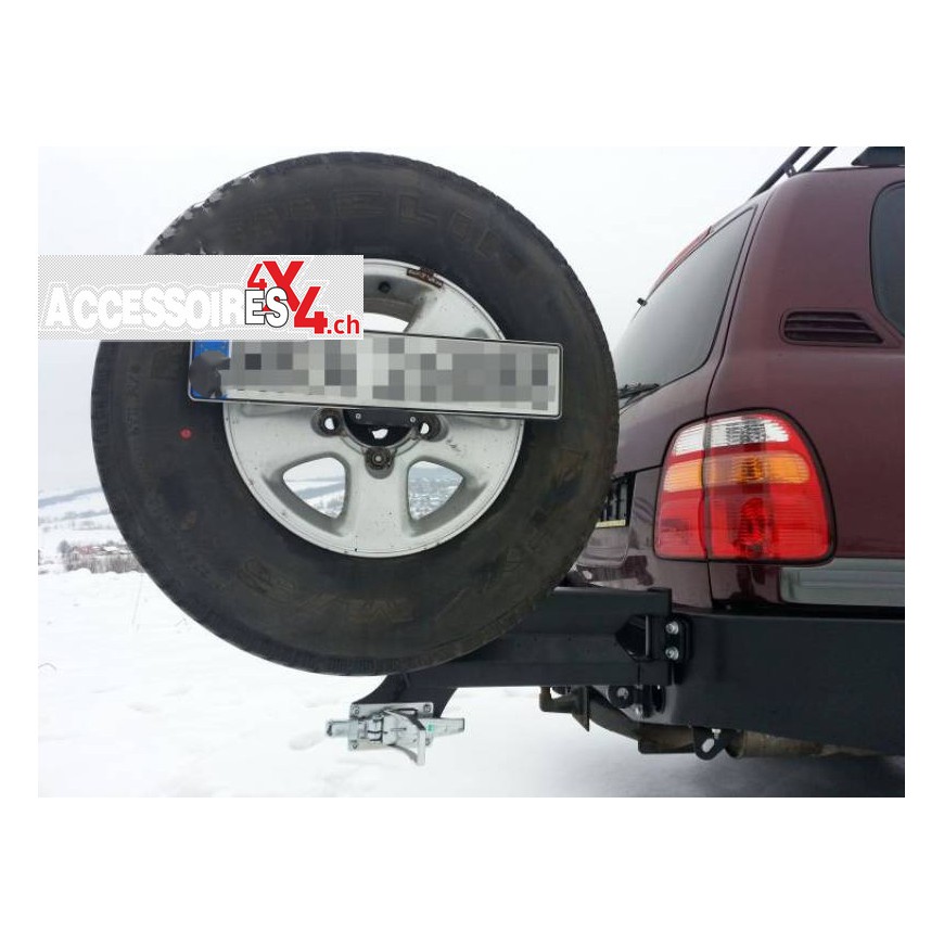 Soporte de rueda de repuesto para TOYOTA LAND CRUISER J100 dedicado al parachoques F4x4. La estructura de montaje está hecha de chapa de 4 mm de espesor. El producto se corta primero con láser, luego se dobla sobre una prensa plegadora y se obtiene la forma correcta mediante acabado manual. La siguiente etapa es la protección anticorrosiva que consiste en galvanizado y recubrimiento en polvo que le da la apariencia final a la fijación. El montaje de la rueda está asistido por un resorte de gas, que facilita el cierre y la apertura en terrenos irregulares. La fijación es muy útil si el automóvil tiene ruedas de gran diámetro, ya que alivia las bisagras del portón trasero. Gracias a la construcción sólida, el soporte no transfiere vibraciones y sonidos desordenados al centro del automóvil. El mango está bloqueado con una abrazadera de metal que evita que la abrazadera se abra automáticamente.