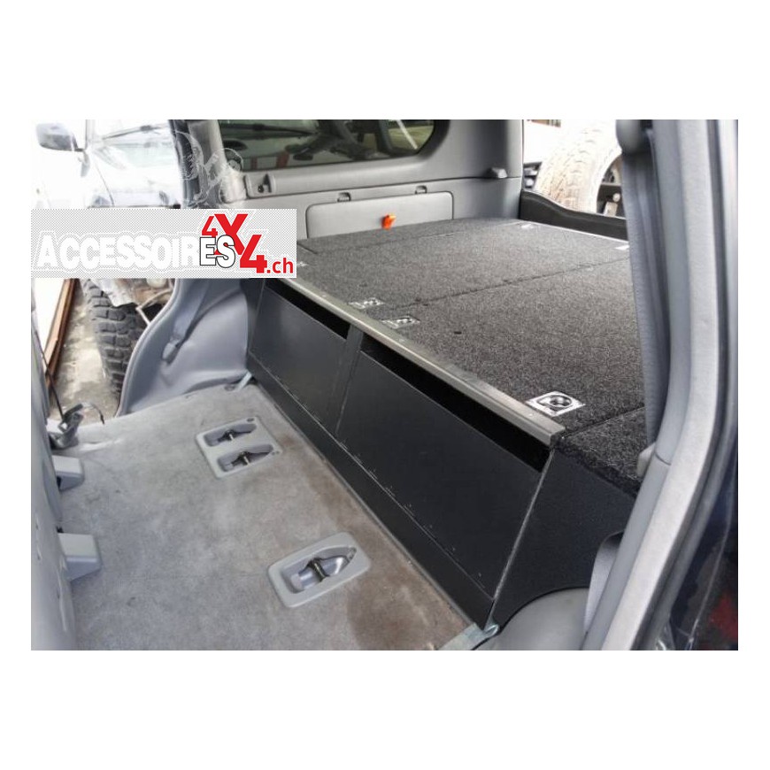 La primera construcción de acero, producida en serie en una tecnología de autoensamblaje, de la más alta calidad y con el deseo de integrarse dentro del automóvil. La estructura portante de la caja, así como los cajones, están hechos de chapa de acero galvanizado que ofrece una muy buena protección contra la corrosión. El mecanismo de apertura del cajón consta de una sección de acero inoxidable y un conjunto de cojinetes montados en la parte inferior y superior de las guías, así como en los lados del cajón. Esta construcción de las guías elimina cualquier juego entre el cajón y la estructura de soporte, lo que garantiza que la carrocería no emite ningún ruido desagradable al conducir en el campo y garantiza una alta fiabilidad. Cada cajón está equipado con dos particiones que se pueden quitar según sea necesario. Las fachadas están pintadas con polvo de plata antiguo, lo que le da toda su estética. Ambos cajones están equipados con cerraduras sólidas de acero inoxidable que se pueden bloquear. La parte superior está hecha de madera contrachapada cubierta con fieltro, fijada en los bordes con una esquina de aluminio, lo que permite que todo se integre perfectamente en la cabina del automóvil y es agradable de usar. El cuerpo está equipado con ocho asas de casillero, lo que permite protección contra objetos resbaladizos como un refrigerador o un cofre colocado en su superficie. En los laterales del panel con cajones y detrás del sofá trasero, hay compartimentos de almacenamiento adicionales, lo que permite el máximo uso del espacio para el equipaje y una mejor organización de los objetos que llevamos en un viaje.