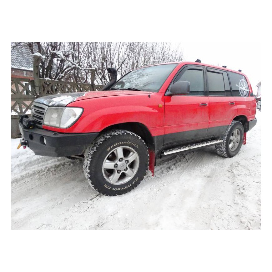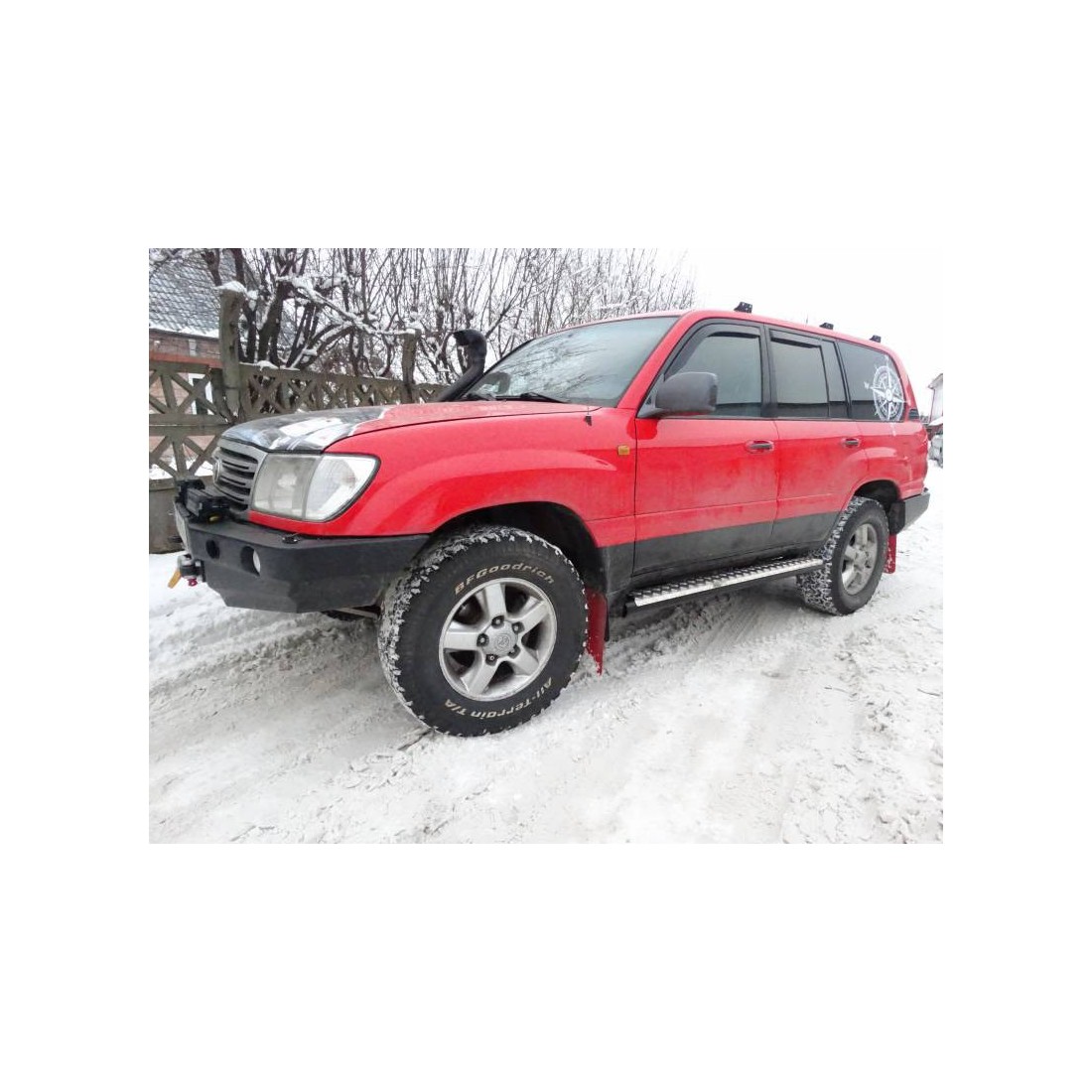 Pasos laterales dedicados al Toyota Land cruiser J100. Los arcos consisten en una tubería de Ø 76 mm y una elevación de 3 mm. El producto primero se corta con láser, luego se pliega en una prensa plegadora controlada numéricamente. La forma correcta se obtiene mediante acabado manual. Después de terminar, el siguiente paso es la protección contra la corrosión, que consiste en galvanizado y recubrimiento en polvo. Luego, los pasos se pierden en aluminio.