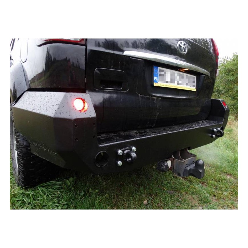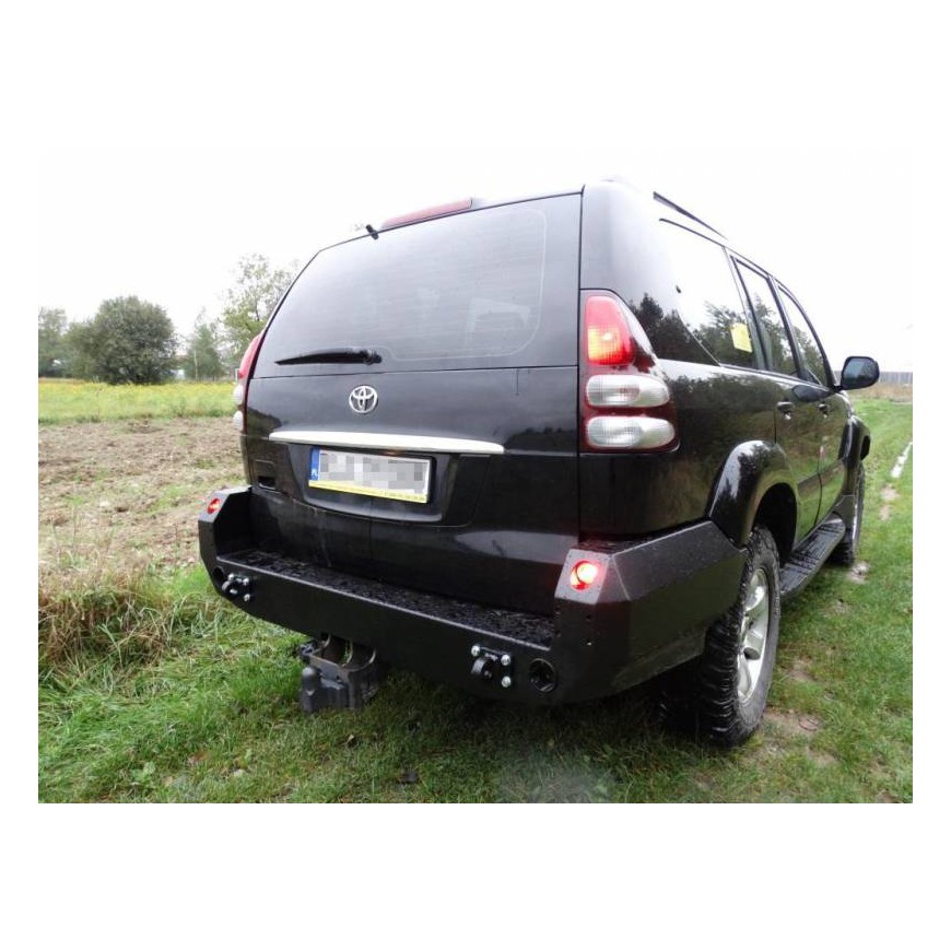 Paragolpes trasero dedicado al automóvil TOYOTA LAND CRUISER J120. La construcción principal del parachoques está hecha de chapa de 4 mm de espesor, y los sujetadores del marco están hechos de chapa de 5 mm de espesor. El producto se corta primero con láser, luego se dobla sobre una prensa plegadora CNC y se obtiene la forma correcta mediante acabado manual. La siguiente etapa es la protección contra la corrosión que consiste en galvanizado y recubrimiento en polvo que le da al parachoques una apariencia final.
