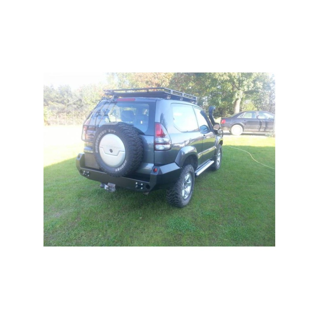 Paragolpes trasero dedicado al automóvil TOYOTA LAND CRUISER J125. La construcción principal del parachoques está hecha de chapa de 4 mm de espesor, y los sujetadores del marco están hechos de chapa de 5 mm de espesor. El producto se corta primero con láser, luego se dobla sobre una prensa plegadora CNC y se obtiene la forma correcta mediante acabado manual. La siguiente etapa es la protección contra la corrosión que consiste en galvanizado y recubrimiento en polvo que le da al parachoques una apariencia final.