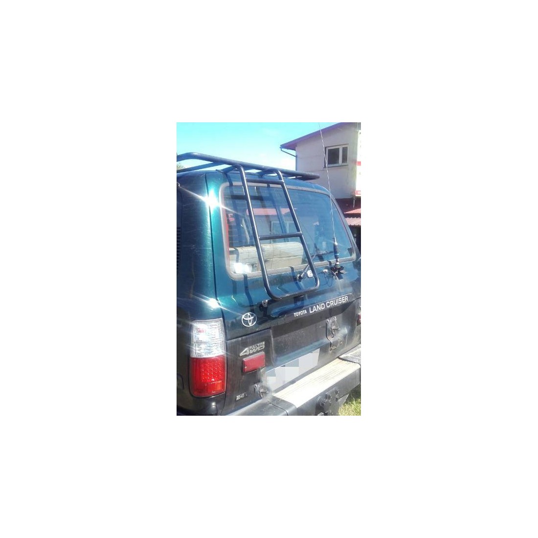 La escalera está hecha de tubo de Ø 25 mm. El producto está hecho completamente a mano. Una vez terminado, está protegido por una imprimación anticorrosiva. El siguiente paso es el recubrimiento en polvo. La escalera vista desde arriba está apoyada en el borde de la puerta trasera y, desde abajo, está montada rígidamente sobre ella. Muy útil cuando se usa una baca.