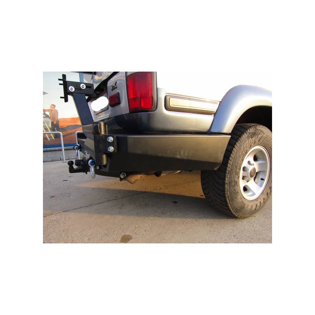 Soporte de rueda de repuesto para TOYOTA LAND CRUISER J80 89-98 dedicado al parachoques F4x4. La estructura de montaje está hecha de chapa de 4 mm de espesor. El producto se corta primero con láser, luego se dobla sobre una prensa plegadora y se obtiene la forma correcta mediante acabado manual. La siguiente etapa es la protección anticorrosiva que consiste en galvanizado y recubrimiento en polvo que le da la apariencia final a la fijación. El montaje de la rueda está asistido por un resorte de gas, que facilita el cierre y la apertura en terrenos irregulares. La fijación es muy útil si el automóvil tiene ruedas de gran diámetro, ya que alivia las bisagras del portón trasero. Gracias a la construcción sólida, el soporte no transfiere vibraciones y sonidos desordenados al centro del automóvil. El mango está bloqueado con una abrazadera de metal que evita que la abrazadera se abra automáticamente.