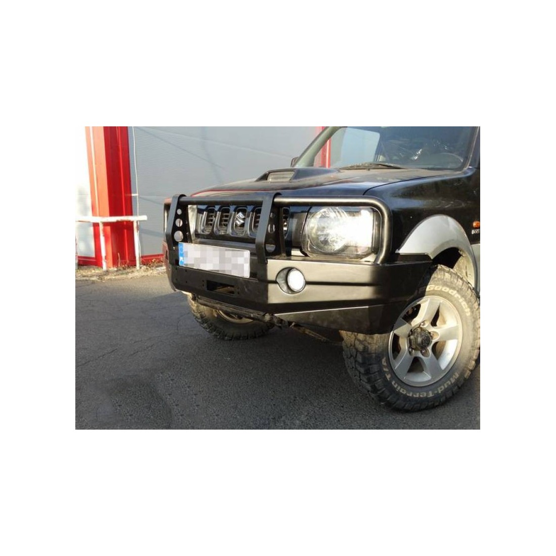 Paragolpes delantero con cabrestante con búfalo, dedicado al automóvil SUZUKI JIMNY III 04-12 1.3 DDiS. La construcción principal del parachoques consiste en chapa de 3 mm de espesor, y la placa para el cabrestante y los sujetadores al marco de chapa de 5 mm de espesor. El producto primero se corta con láser, luego se pliega en una prensa plegadora controlada numéricamente. La forma correcta se obtiene mediante acabado manual. El siguiente paso es la protección contra la corrosión, que consiste en una galvanización y un recubrimiento en polvo que le da al parachoques una apariencia final. Este parachoques presenta orificios de montaje para las empuñaduras, dos orificios para levantar y orificios para lámparas halógenas. La construcción de acero sólido permite una operación potente del parachoques en el campo. El parachoques mejora significativamente la comodidad de la conducción todoterreno, permite el uso práctico del cabrestante, mejora la seguridad y le da al automóvil el carácter apropiado. En el juego encontrarás todos los elementos necesarios para el montaje.
