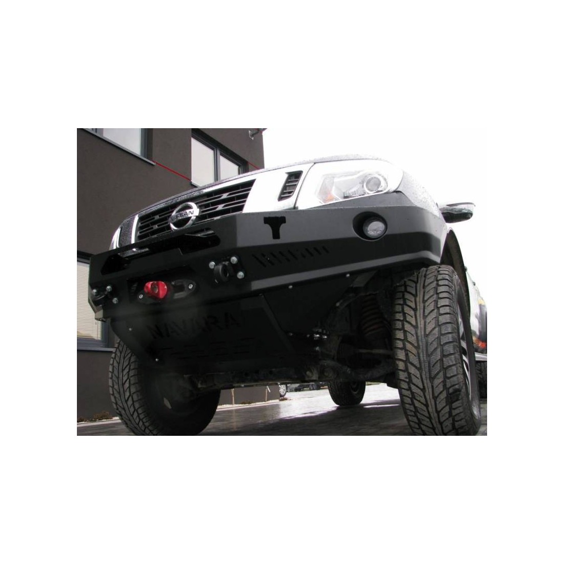 Parachoques delantero con placa de cabrestante, dedicado a NISSAN Navara D23. La construcción principal del paragolpes consiste en chapa de 4 mm de espesor y la placa para el cabrestante y los sujetadores de marco de 5 mm de espesor. El producto primero se corta con láser, luego se pliega en una prensa plegadora controlada numéricamente. La forma correcta se obtiene mediante acabado manual. El siguiente paso es la protección contra la corrosión, que consiste en una galvanización y un recubrimiento en polvo que le da al parachoques una apariencia final. Este parachoques tiene orificios de montaje para las empuñaduras, dos orificios para elevaciones altas y dos orificios para lámparas halógenas. La construcción de acero sólido permite el funcionamiento completo del parachoques en el suelo. El parachoques mejora significativamente la comodidad de la conducción todoterreno, permite el uso práctico del cabrestante, mejora la seguridad y le da al automóvil el carácter apropiado. En el juego encontrarás todos los elementos necesarios para el montaje.
