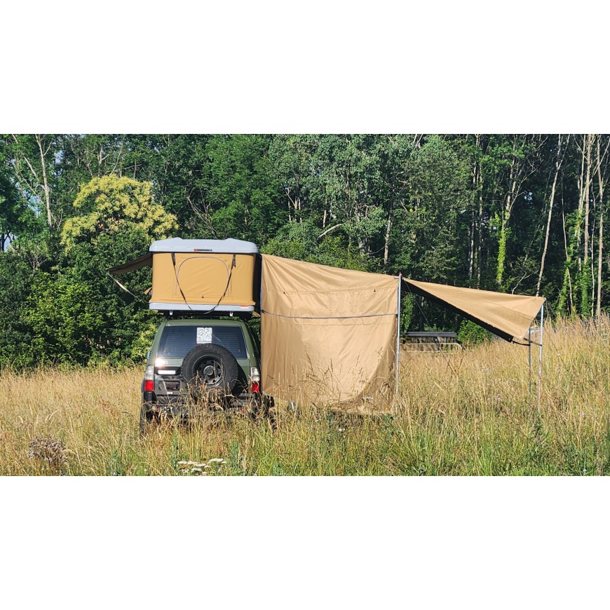 Toldo Tundra para fijar al raíl de la tienda de techo modelo Tundra a partir de mayo de 2024. Suministrado con 4 postes de soporte telescópicos y 1 barra tensora telescópica.