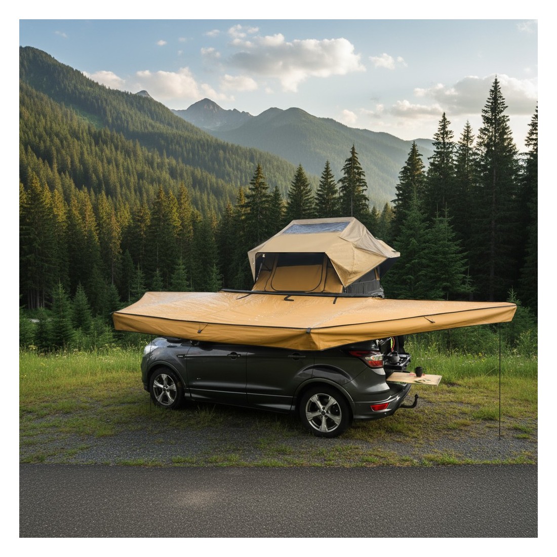 Gracias a su montaje exterior en la baca o barras de techo, este toldo no ocupa ningún espacio en el interior del vehículo, evitando llevar carpas o sombrillas voluminosas. Se pliega rápidamente y se guarda en una bolsa compacta, lo que permite conservar espacio valioso en el maletero para otros equipos (frigorífico, cajas de almacenamiento, material de acampada…). ¡Una solución inteligente para los viajeros preocupados por el espacio!