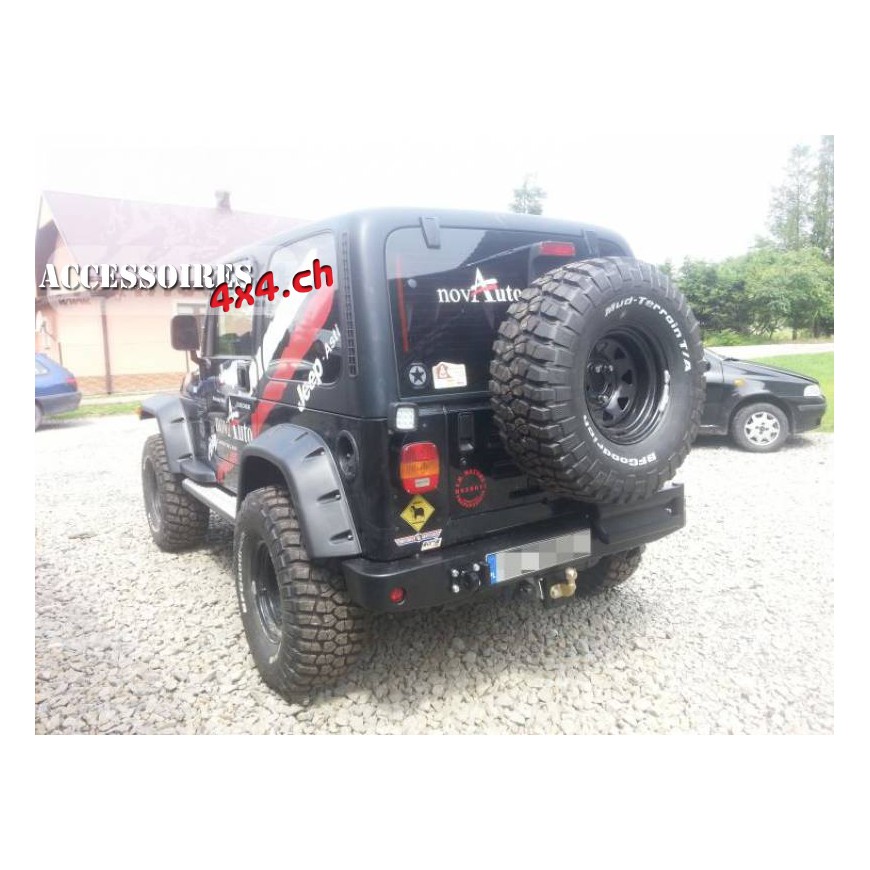 Soporte de rueda de repuesto para JEEP WRANGLER TJ 90-06 dedicado al parachoques F4x4. La estructura de montaje está hecha de chapa de 4 mm de espesor. El producto se corta primero con láser, luego se dobla sobre una prensa plegadora y se obtiene la forma correcta mediante acabado manual. La siguiente etapa es la protección anticorrosiva que consiste en galvanizado y recubrimiento en polvo que le da la apariencia final a la fijación. El montaje de la rueda está asistido por un resorte de gas, que facilita el cierre y la apertura en terrenos irregulares. La fijación es muy útil si el automóvil tiene ruedas de gran diámetro, ya que alivia las bisagras del portón trasero. Gracias a la construcción sólida, el soporte no transfiere vibraciones y sonidos desordenados al centro del automóvil. El mango está bloqueado con una abrazadera de metal que evita que la abrazadera se abra automáticamente.