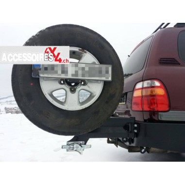 Support de roue de secours pour TOYOTA LAND CRUISER J100 dédié au pare-chocs F4x4. La structure de montage est en tôle de 4 mm d'épaisseur. Le produit est d'abord découpé au laser, puis plié sur une presse plieuse. La forme correcte est obtenue par finition manuelle. La prochaine étape est la protection anticorrosion consistant en une galvanisation et un revêtement en poudre qui donne l’apparence finale à la fixation. Le montage de la roue est assisté par un amortisseur à gaz qui facilite la fermeture et l'ouverture sur des terrains accidentés. La fixation est très utile si la voiture a des roues de grand diamètre, car elle soulage les charnières du hayon. Grâce à la construction solide, le support ne transfère pas les vibrations et les sons désordonnés au centre de la voiture. La poignée est verrouillée avec une pince métallique qui empêche la pince de s'ouvrir automatiquement.