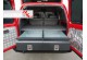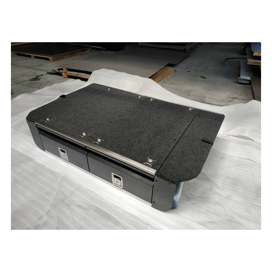 La première construction en acier, produite en série dans une technologie à monter soi-même, de la plus haute qualité et avec le souci de s'intégrer à l'intérieur de la voiture. La structure portante de la caisse, ainsi que les tiroirs, sont en tôle d'acier galvanisée qui offre une très bonne protection contre la corrosion. Le mécanisme d'ouverture du tiroir se compose d'une section en acier inoxydable et d'un ensemble de roulements montés à la fois sur le bas et le haut des guides ainsi que sur les côtés du tiroir. Cette construction des guides élimine tout jeu entre le tiroir et la structure de support, ce qui garantit qu'aucun bruit désagréable ne soit émis par la carrosserie lors de la conduite sur le terrain et garantit une grande fiabilité. Chacun des tiroirs est équipé de deux cloisons pouvant être retirées en fonction des besoins. Les façades sont peintes à la poudre d'argent antique, ce qui confère toute leur esthétique. Les deux tiroirs sont équipés de serrures solides en acier inoxydable pouvant être verrouillées. La partie supérieure est faite de contreplaqué recouvert de feutre, fixé sur les bords avec un coin en aluminium, ce qui permet à l'ensemble de se fondre parfaitement dans l'habitacle de la voiture et est agréable à utiliser. La carrosserie est équipée de huit poignées de casier, permettant une protection contre les objets glissants tels qu'un réfrigérateur ou un coffre placé à sa surface. Sur les côtés du panneau avec tiroirs et derrière le canapé arrière, il y a des compartiments de rangement supplémentaires, ce qui permet une utilisation maximale de l'espace pour les bagages et une meilleure organisation des objets que nous emportons en voyage.