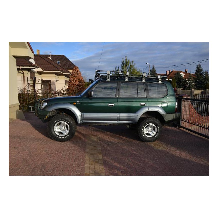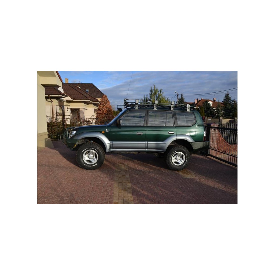 Galerie de toit avec filet pour TOYOTA J95. Le porte-bagages est composé de tubes de 25 mm de diamètre recouverts d'un treillis de 30 x 30 mm. À l'avant du coffre, une bande facilite l'installation des lampes et des supports pour le montage de la plaque d'immatriculation. Des solutions similaires se trouvent sur les côtés et à l'arrière du coffre. Vous pouvez également monter le store sans aucun problème. Le coffre est facile à assembler et à démonter. Cela facilitera certainement les longs trajets liés au transport de plus de bagages ou d'une tente de toit.
