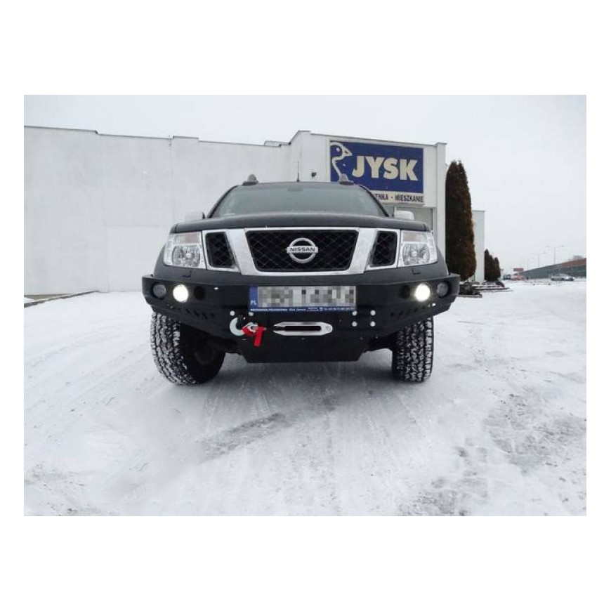 Pare-chocs avant avec plaque pour treuil sans pare-buffle, dédié à la voiture NISSAN NAVARA D40 10-14. La construction principale du pare-chocs est constituée de tôle de 3 mm d'épaisseur, et la plaque pour le treuil et les fixations au châssis de tôle de 5 mm d'épaisseur. Le produit est d'abord découpé au laser, puis plié sur une presse plieuse à commande numérique. La forme correcte est obtenue par finition manuelle. La prochaine étape est la protection contre la corrosion, qui consiste en une galvanisation et un revêtement en poudre qui donne un aspect final au pare-chocs.