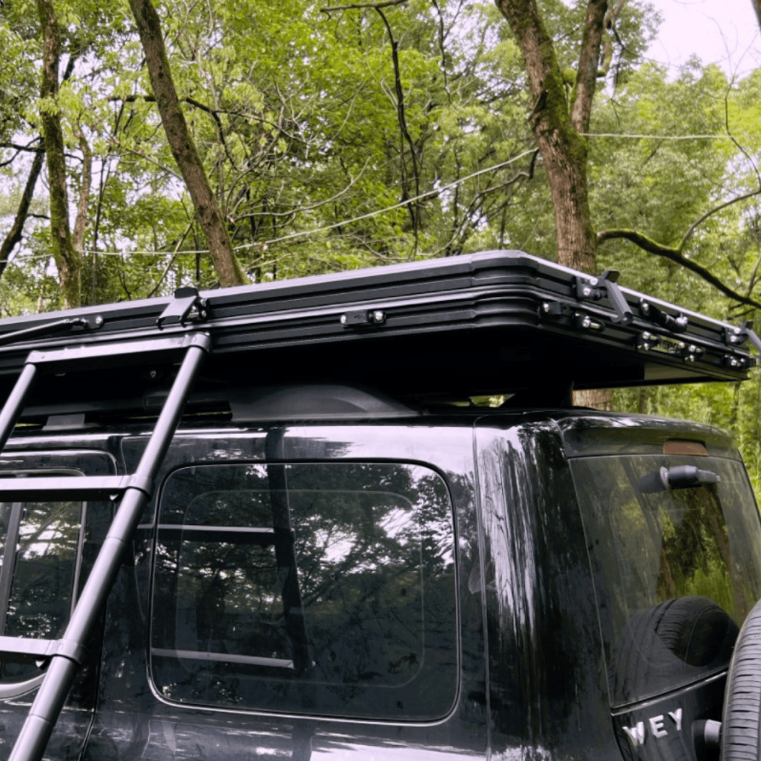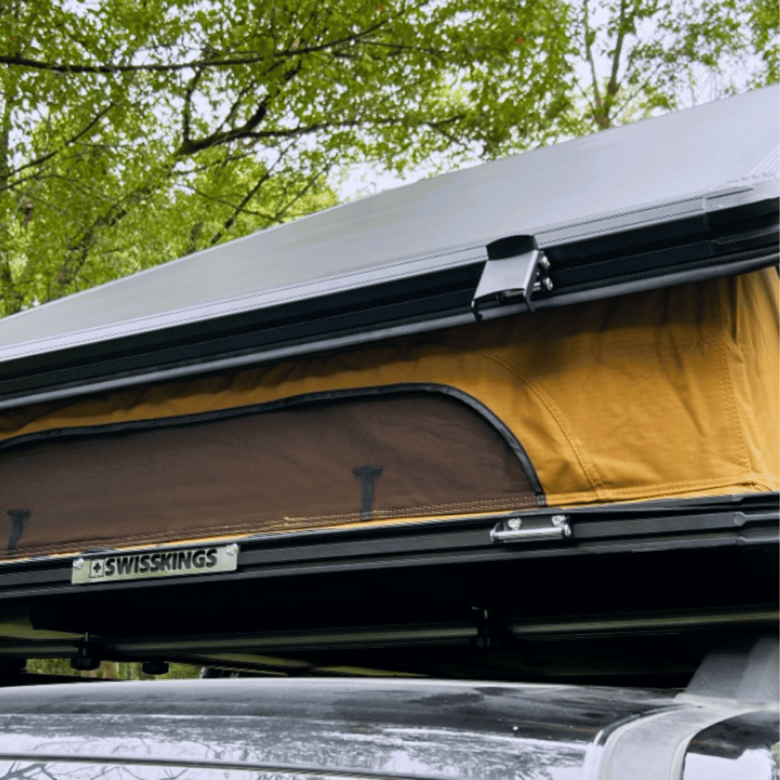 Tente de toit 2 places coque rigide ultra fine – Swisskings Taiga 13cm avec terrasse, vue à 180°