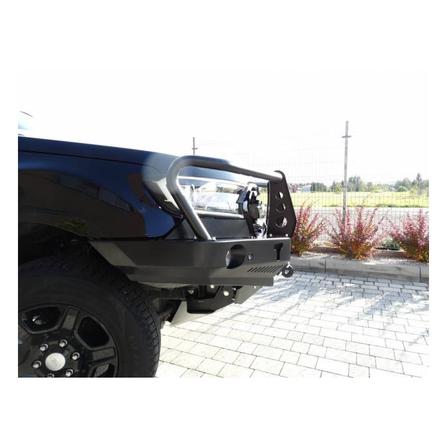 Paraurti anteriore con piastra argano con bufalo, dedicato all'auto FORD RANGER T6 15-19 3.2 DIESEL. La struttura principale del paraurti è costituita da una lamiera di 3 mm di spessore e la piastra per verricello e elementi di fissaggio al telaio in lamiera di 5 mm di spessore. Il prodotto viene prima tagliato a laser, quindi piegato su una pressa piegatrice a controllo numerico. La forma corretta si ottiene con la finitura manuale. Il passo successivo è la protezione dalla corrosione, che consiste in una zincatura e un rivestimento in polvere che conferisce al paraurti un aspetto finale. Questo paraurti presenta fori di montaggio per le impugnature, due fori per il sollevamento e fori per le lampade alogene. La solida struttura in acciaio consente un potente funzionamento del paraurti sul campo. Il paraurti migliora significativamente il comfort della guida fuoristrada, consente un uso pratico del verricello, migliora la sicurezza e conferisce all'auto il suo carattere appropriato. Nel gioco troverai tutti gli elementi necessari per l'assemblaggio.