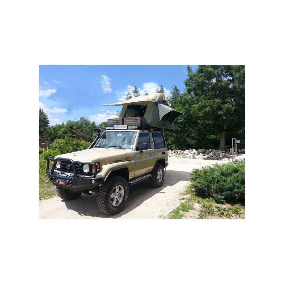 Portapacchi con rete per TOYOTA HZJ 71. Il portapacchi è realizzato con tubi del diametro di 25 mm, ricoperti da una rete 30 x 30 mm e verniciati a polvere. Nella parte anteriore del bagagliaio c'è una striscia per una facile installazione di lampade e supporti per il montaggio della targa. Le soluzioni rinforzate sono sui lati e sul retro del bagagliaio. Puoi anche montare la tenda senza problemi. Il tronco è facile da montare e smontare. Faciliterà sicuramente lunghi viaggi legati al trasporto di più bagagli o di una tenda sul tetto.