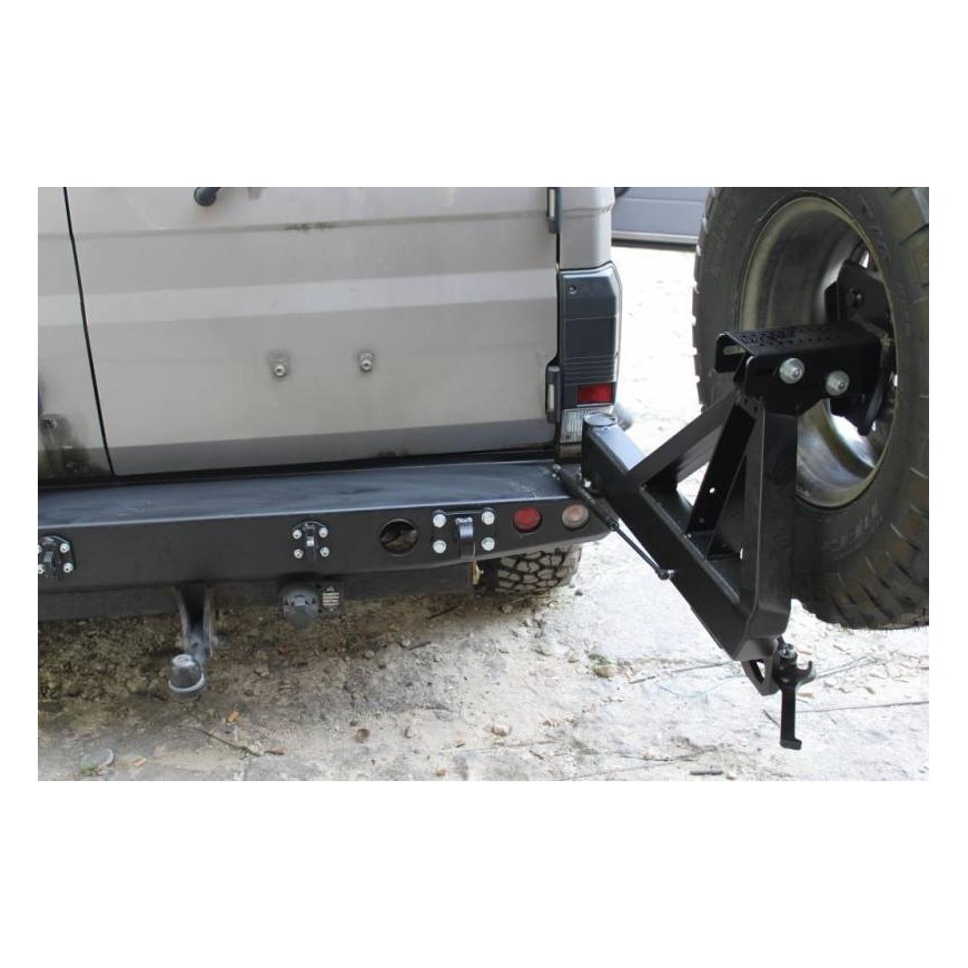 Supporto per ruota di scorta per automobile TOYOTA HZJ71 99-07 dedicata al paraurti F4x4. La struttura di montaggio è realizzata in lamiera spessa 4 mm. Il prodotto viene prima tagliato con il laser, quindi piegato su una pressa piegatrice e la forma corretta si ottiene con la finitura manuale. La fase successiva è la protezione dalla corrosione costituita da zincatura e verniciatura a polvere che conferisce l'aspetto finale al fissaggio. Il montaggio della ruota allevia la porta posteriore ed è utile quando l'auto ha ruote di grande diametro. Grazie alla solida struttura, il supporto non trasferisce vibrazioni e suoni al centro dell'auto.