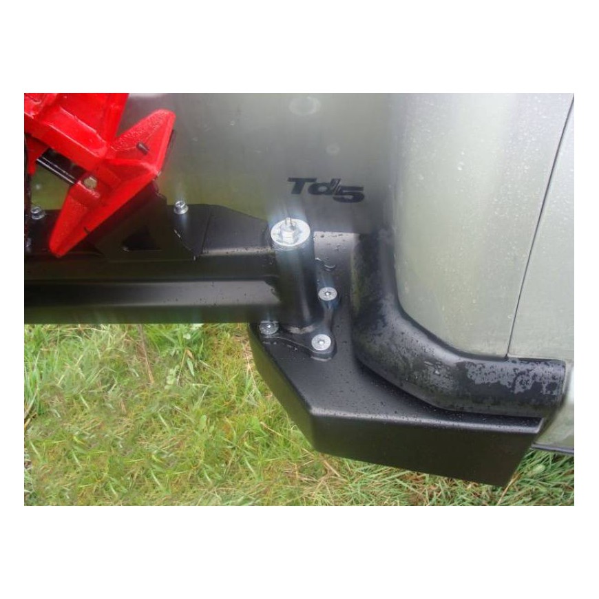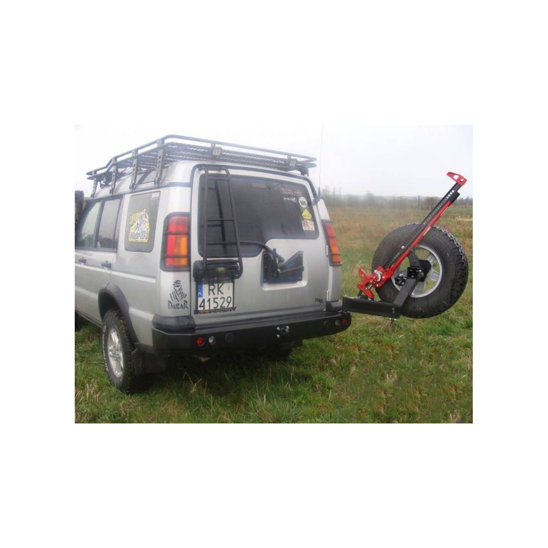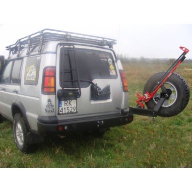 Supporto ruota di scorta per LAND ROVER DISCOVERY II dedicato al paraurti F4x4. La struttura di montaggio è realizzata in lamiera di spessore 4 mm. Il prodotto viene prima tagliato con il laser, quindi piegato su una pressa piegatrice e la forma corretta si ottiene con la finitura manuale. La fase successiva è la protezione anticorrosiva costituita da zincatura e verniciatura a polvere che conferisce l'aspetto finale al fissaggio. Il montaggio della ruota è assistito da una molla a gas, che facilita la chiusura e l'apertura su terreni irregolari. Il fissaggio è molto utile se l'auto ha ruote di grande diametro, perché allevia le cerniere del portellone. Grazie alla solida struttura, il supporto non trasferisce vibrazioni e suoni disordinati al centro dell'auto. L'impugnatura è bloccata con un morsetto metallico che impedisce l'apertura automatica del morsetto.