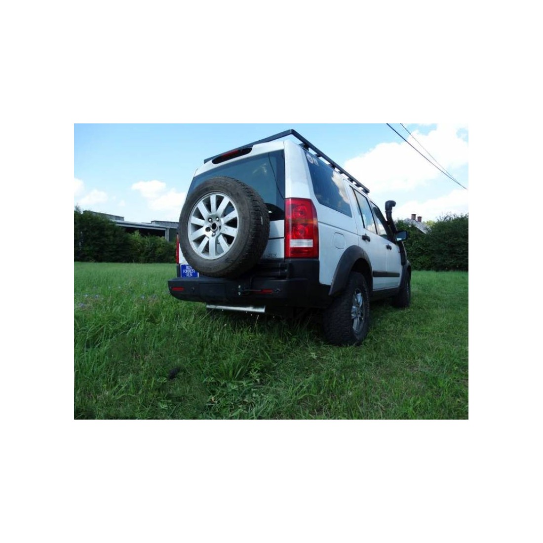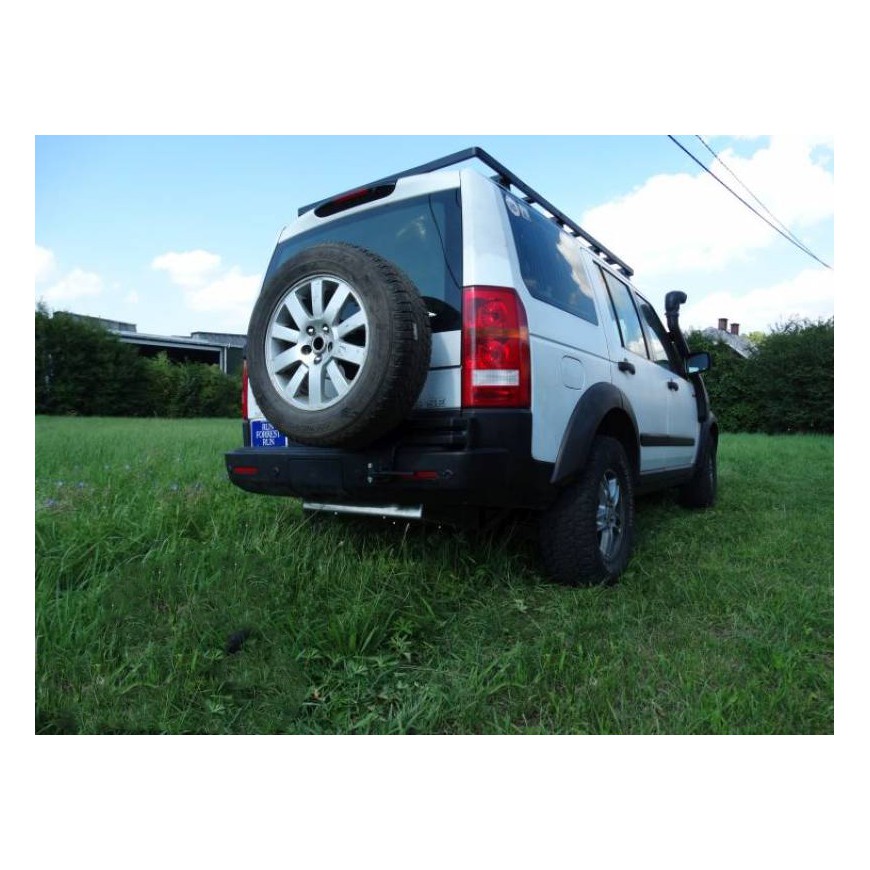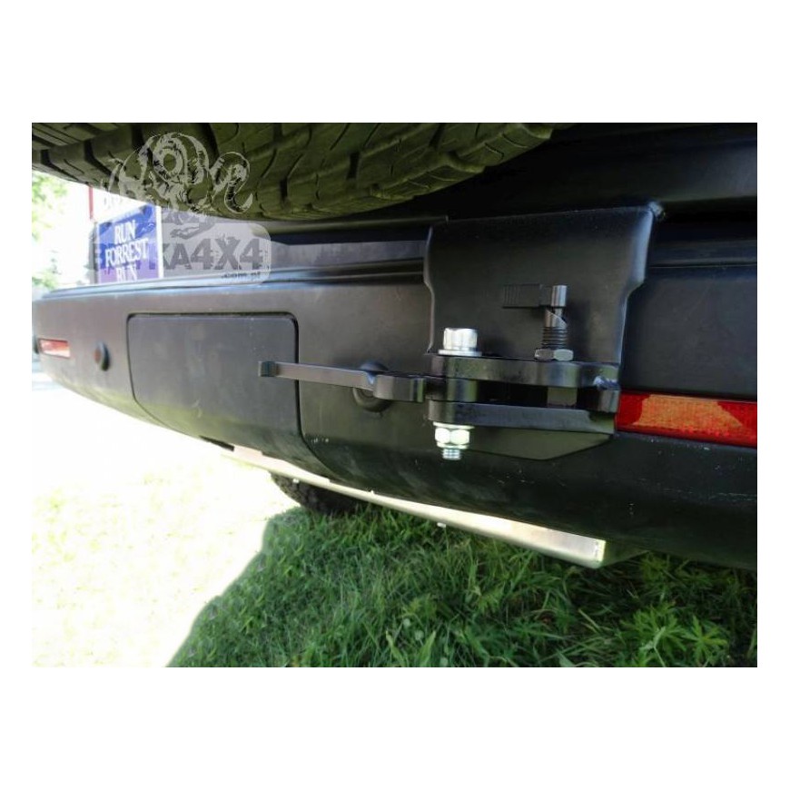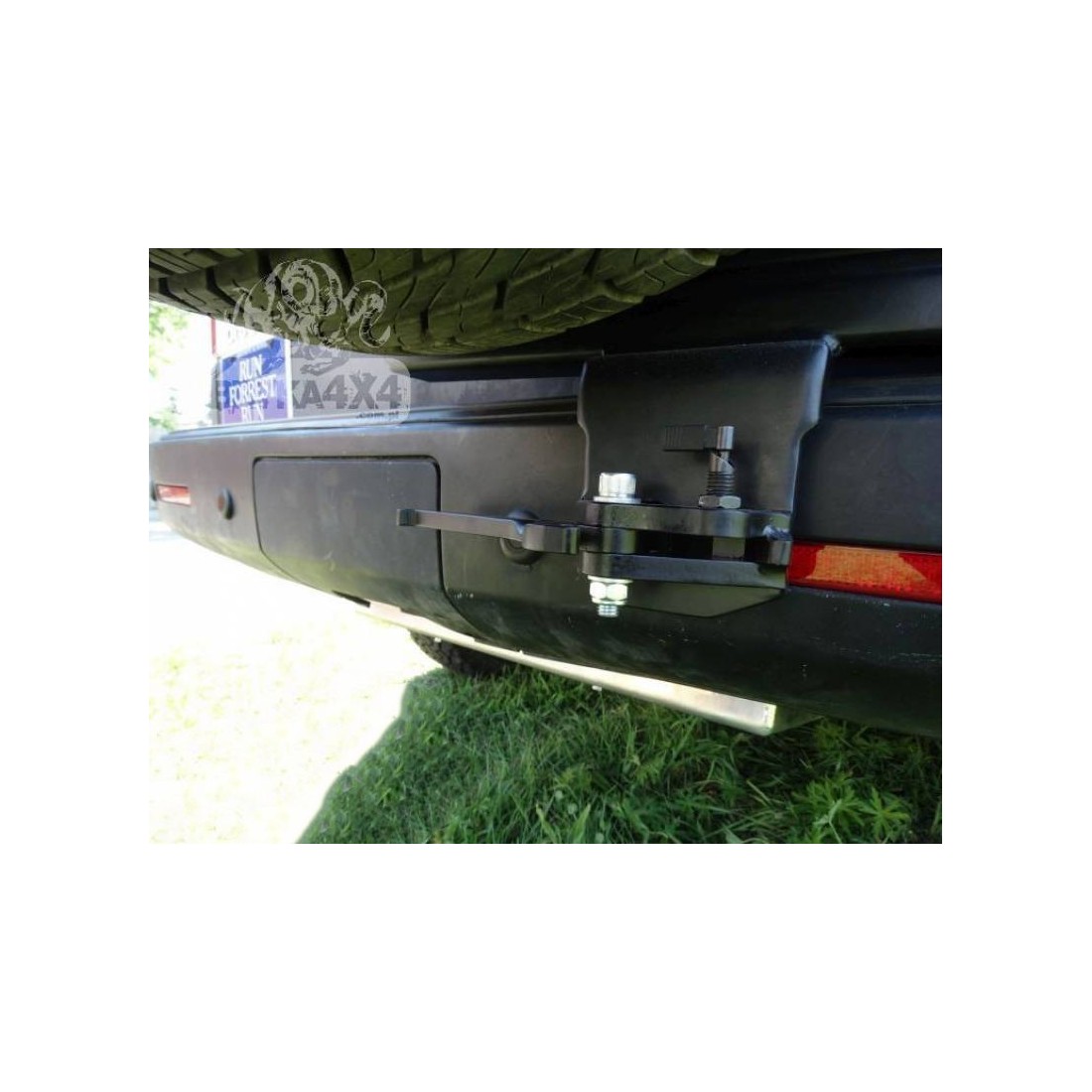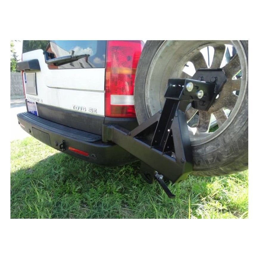 Supporto ruota di scorta per LAND ROVER DISCOVERY III dedicato al paraurti F4x4. La struttura di montaggio è realizzata in lamiera di spessore 4 mm. Il prodotto viene prima tagliato con il laser, quindi piegato su una pressa piegatrice e la forma corretta si ottiene con la finitura manuale. La fase successiva è la protezione anticorrosiva costituita da zincatura e verniciatura a polvere che conferisce l'aspetto finale al fissaggio. Il montaggio della ruota è assistito da una molla a gas, che facilita la chiusura e l'apertura su terreni irregolari. Il fissaggio è molto utile se l'auto ha ruote di grande diametro, perché allevia le cerniere del portellone. Grazie alla solida struttura, il supporto non trasferisce vibrazioni e suoni disordinati al centro dell'auto. L'impugnatura è bloccata con un morsetto metallico che impedisce l'apertura automatica del morsetto.