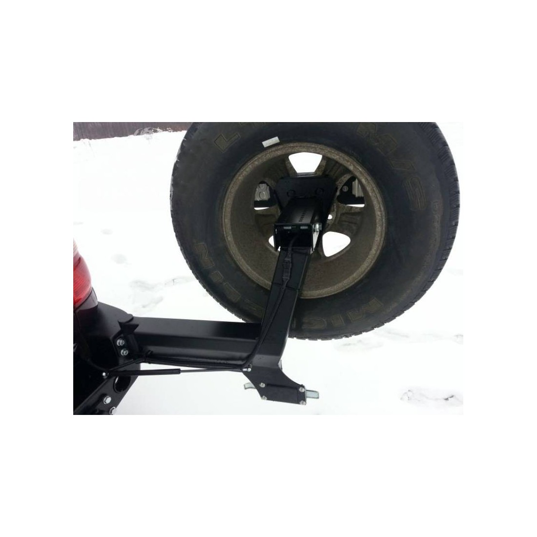 Supporto ruota di scorta per TOYOTA LAND CRUISER J100 dedicato al paraurti F4x4. La struttura di montaggio è realizzata in lamiera di spessore 4 mm. Il prodotto viene prima tagliato con il laser, quindi piegato su una pressa piegatrice e la forma corretta si ottiene con la finitura manuale. La fase successiva è la protezione anticorrosiva costituita da zincatura e verniciatura a polvere che conferisce l'aspetto finale al fissaggio. Il montaggio della ruota è assistito da una molla a gas, che facilita la chiusura e l'apertura su terreni irregolari. Il fissaggio è molto utile se l'auto ha ruote di grande diametro, perché allevia le cerniere del portellone. Grazie alla solida struttura, il supporto non trasferisce vibrazioni e suoni disordinati al centro dell'auto. L'impugnatura è bloccata con un morsetto metallico che impedisce l'apertura automatica del morsetto.